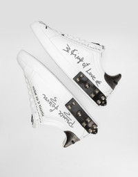 Calfskin sneakers: • Multi-colored • Portofino Spoiler shape • TPU outsole • Polyurethane fussbett insole wrapped in leather and customized with label • With patch, studs and print • Item equipped with a black cotton bag and a box made of recycled paper cellulose fiber • Sole height 15 mm • Made in Italy External Composition: 70% Calfskin, 10% Silk, 5% Cotton, 5% Polyester, 5% Polyurethane, 5% Viscose Internal Composition: 70% Lambskin, 20% Goatskin, 5% Polyester, 5% Natural Rubber
