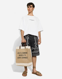 Practical and spacious, this new shopper is crafted from printed jute with canvas details and features calfskin top handles. Printed jute tote bag with canvas details: • Beige • Calfskin top handles with rounded studs • Item comes with a branded dust bag • Measurements: H42 x W34 x D22 cm • Made in Italy External composition: 80% Jute 10% Calfskin 10% Cotton Internal composition: 100% Jute