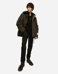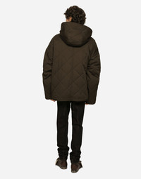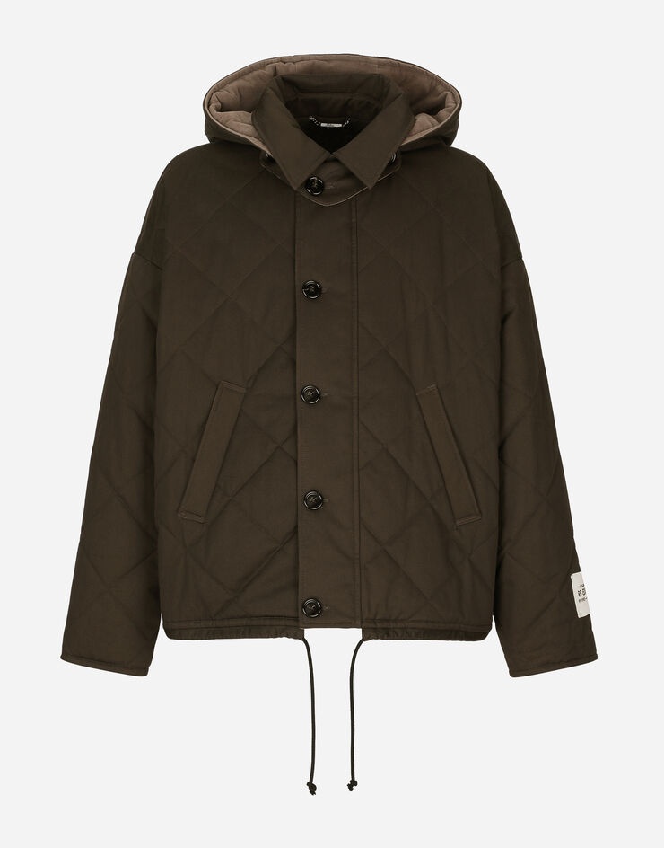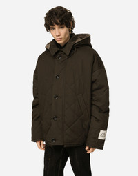 Quilted high-neck jacket with hood in cotton gabardine with the Re-Edition label: • Gray • Wad padding • Regular fit • Detachable hood with fustian lining • Concealed front zipper and button fastening • Outer welt pockets and inner welt pockets with zipper • Drawstring hem • Lined • The piece measures 78 cm from the rear collar seam on a size IT 48 • The model is 185 cm tall and wears a size IT 48 • Made in Italy Care And Details External composition: 99% Cotton 1% Spandex Internal composition: 100% Cotton