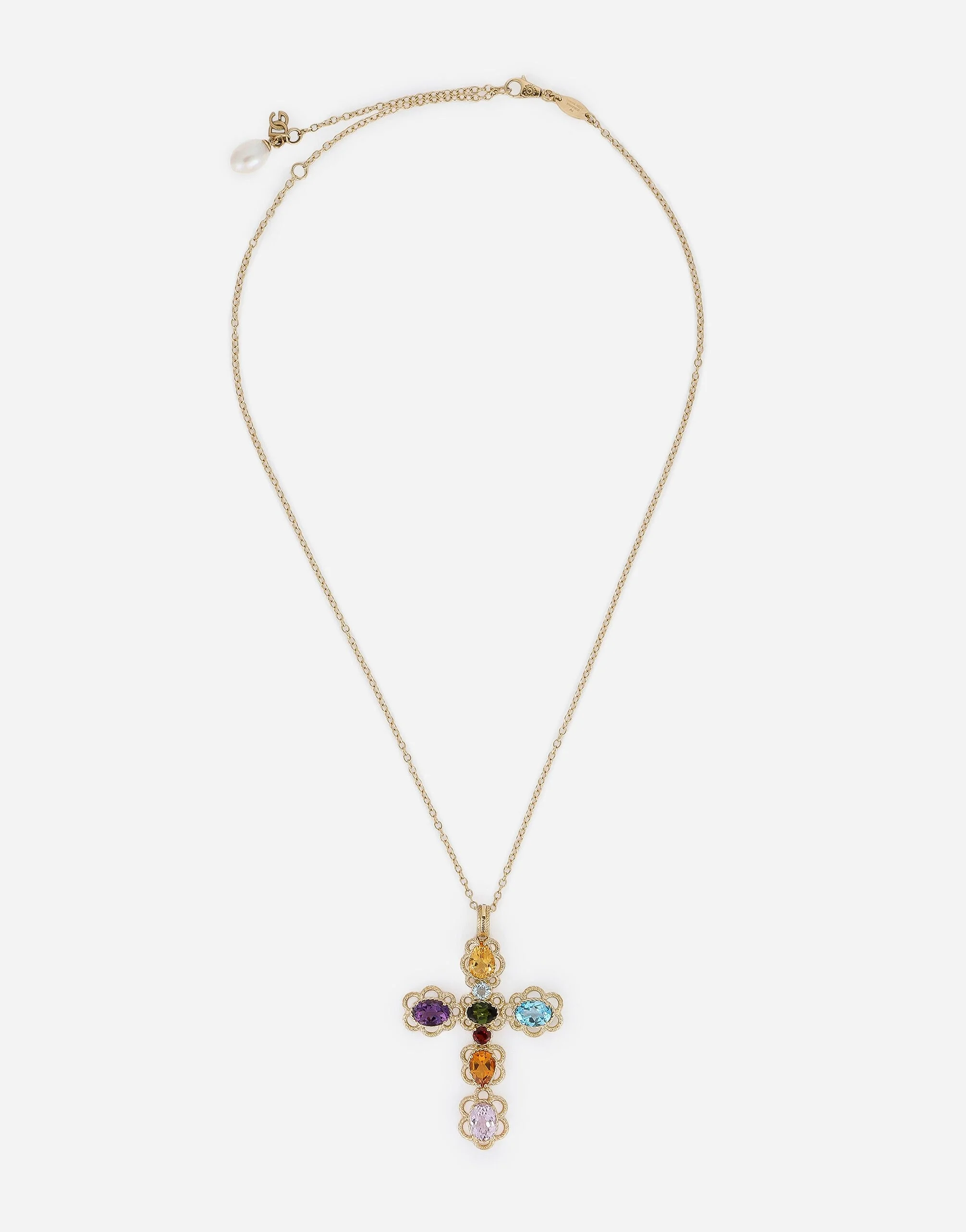 This pendant consists of a yellow gold chain and a charm with 8 different gems in rainbow colors, of different cuts and arranged to create a cross shape, characterized by a spring clasp that allows the cross to detach from the chain. The adjustable chain is enriched with a DG charm and a pearl. Technical features: 18 Kt yellow gold Gems: 1 yellow drop citrine quartz 1 round aquamarine 1 oval blue "Swiss" topaz 1 oval green tourmaline 1 oval purple amethyst 1 round red garnet 1 orange drop "Madera" quartz 1 oval pink kunzite 1 oval freshwater pearl Made in Italy External Composition: Yellow Gold 750/000