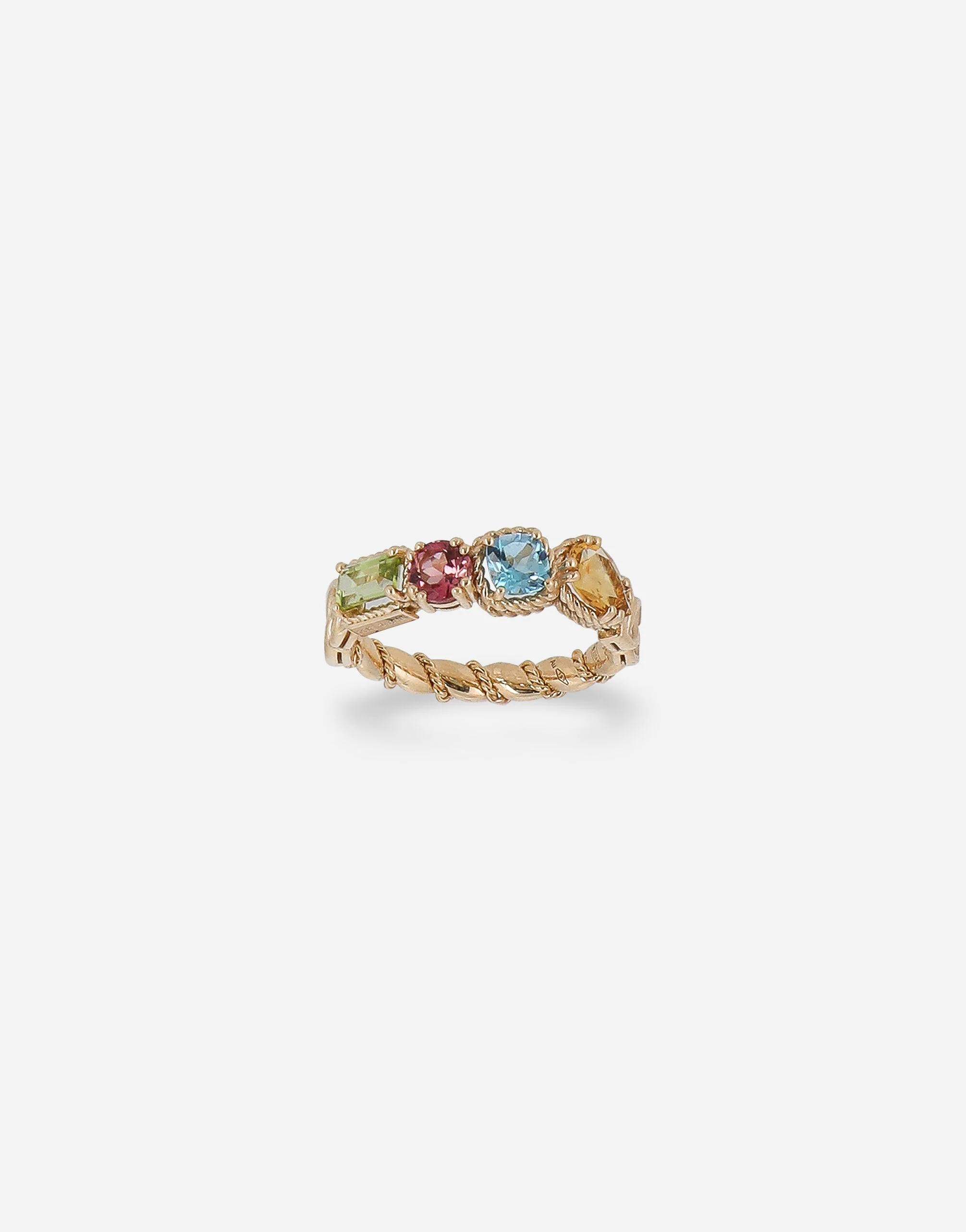 18kt yellow gold ring made up of a sequence of colored gems in the colors of the rainbow, reveals a gold shank around which a cord wraps, enriching it with the discreet preciousness of a meticulously handcrafted work. Technical features: 18Kt yellow gold Gems: 1 square "Swiss" blue topaz 1 round pink tourmaline 1 yellow drop-shaped citrine quartz 1 rectangular green peridot Made in Italy Technical features: Yellow gold 750/000