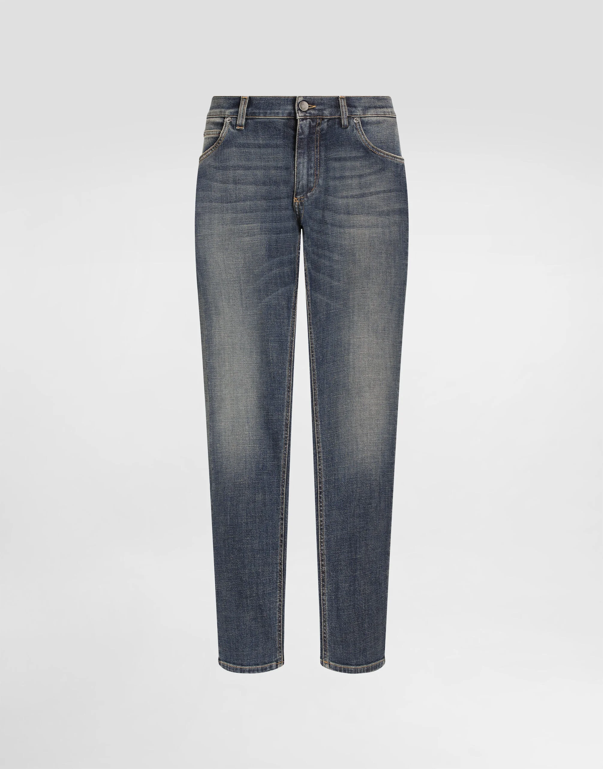 The “Essential” Collection is the modern men’s closet designed by Dolce&Gabbana. A range of timeless, iconic pieces developed across all product categories. Five-pocket regular jeans in stretch denim: • Blue •Regular fit •Fly-covered zipper and button fastening •Metal Dolce&Gabbana logo plate on the back •The item measures 105 cm on the outer leg and the hem is 17 cm wide on a size IT 48 •The model is 185 cm tall and wears a size IT 48 •Made in Italy External composition: 98% Cotton 2% Spandex
