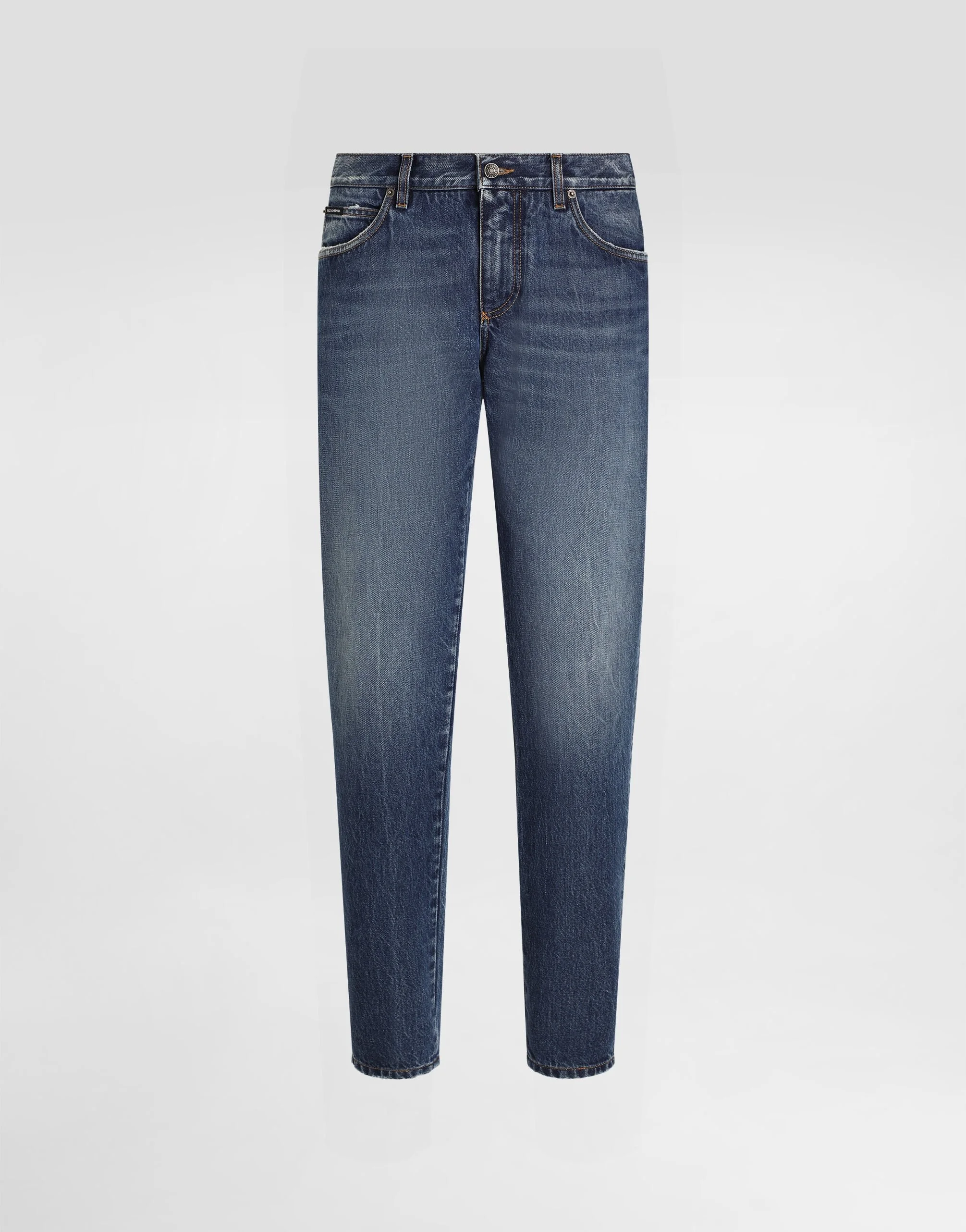 The Italian Holiday Men's Collection revisits 1950s style with a blend of relaxed fits and modern flair. Classic white shirts and tailored suits in refined fabrics contrast with casual denim and playful T-shirts featuring retro graphics with a futuristic twist. Bold prints—chessboards, cats, elegant lighters, and Mediterranean blue ribbons—alongside logo jacquard inspired by ties, infuse a contemporary edge into the essence of Italian holidays. Five-pocket slim-fit jeans in stretch cotton: • Blue • Regular fit • Fly-covered zipper and button fastening • Metal Dolce&Gabbana logo tag on the back • The item measures 105 cm on the outer leg and the hem is 17.5 cm wide on a size IT 48 • Made in Italy External composition: 100% Cotton