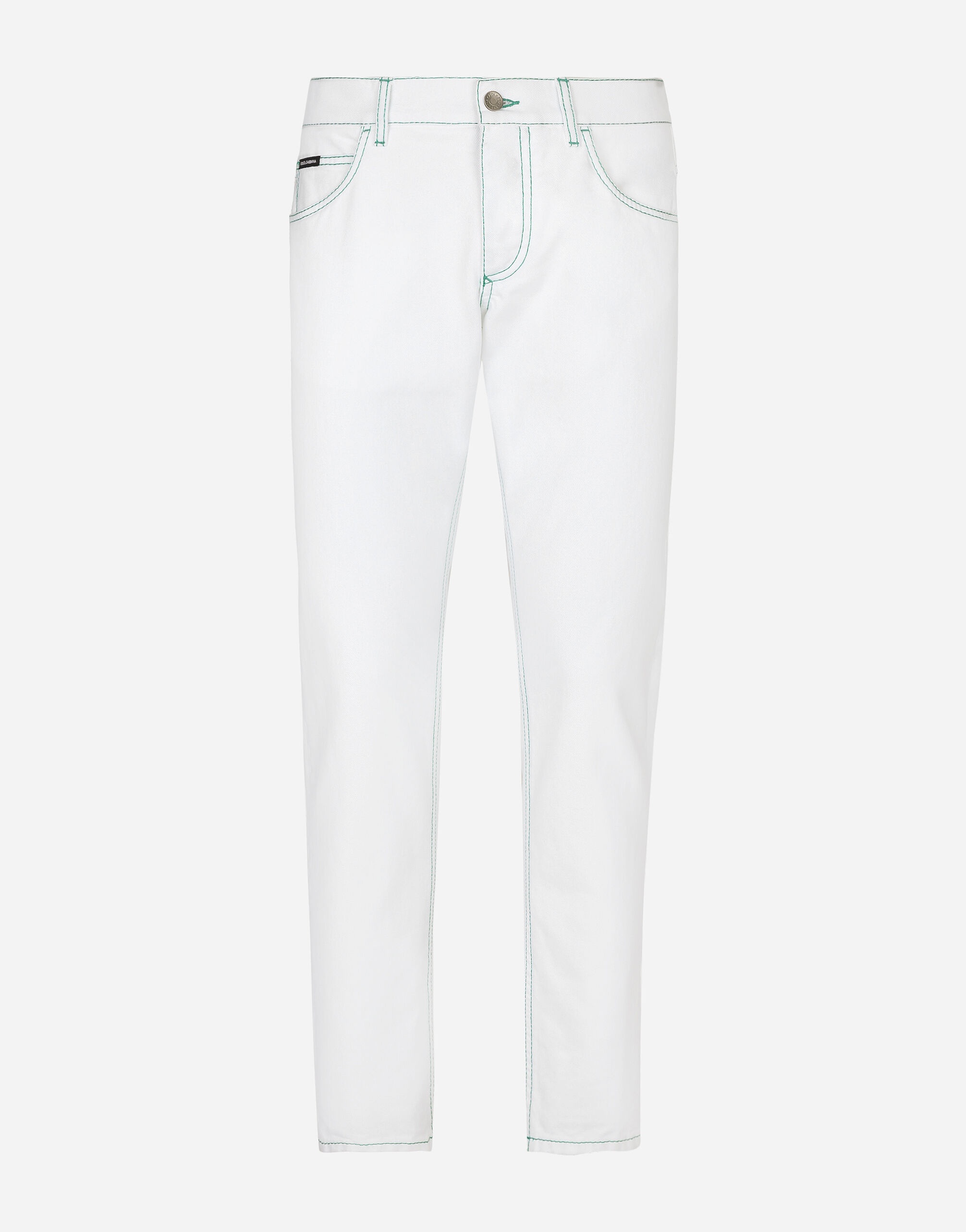 Pictorial, at times volumetric with a textured effect, the decorative “calligraphic-naturalistic” majolica in solid-color green gives life to a collection distinguished by eclectic silhouettes, some stolen from the world of sports, with a cool and light vibe. The vibrant two-tone accenting – green and white – is designed to enhance a series of details, such as the pockets, the green piping paired with the white silk pajamas, the stripes on the polo-shirts, the cuffs on the shirts or the jersey inserts on the T-shirts. Five-pocket regular-fit jeans in cotton denim: • White • Regular fit • Fly-covered zipper and button fastening • Metal Dolce&Gabbana logo tag on the back • The item measures 105 cm on the outer leg and the hem is 17 cm wide on a size IT 48 • Made in Italy External composition: 100% Cotton