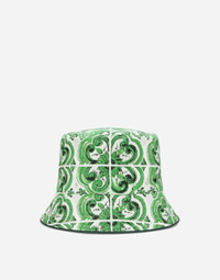 Pictorial, at times volumetric with a textured effect, the decorative “calligraphic-naturalistic" majolica in solid-color green gives life to a collection distinguished by eclectic silhouettes, some stolen from the world of sports, with a cool and light vibe. The vibrant two-tone accenting - green and white - is designed to enhance a series of details, such as the pockets, the green piping paired with the white silk pajamas, the stripes on the polo-shirts, the cuffs on the shirts or the jersey inserts on the T-shirts. Reversible cotton drill bucket hat with majolica print: • Green and white • Top-stitched brim • Lined • Made in Italy External composition: 96% Cotton 3% Spandex 1% Polyester Internal composition: 100% Cotton