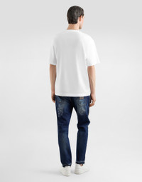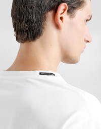 The Italian Holiday Men's Collection revisits 1950s style with a blend of relaxed fits and modern flair. Classic white shirts and tailored suits in refined fabrics contrast with casual denim and playful T-shirts featuring retro graphics with a futuristic twist. Bold prints—chessboards, cats, elegant lighters, and Mediterranean blue ribbons—alongside logo jacquard inspired by ties, infuse a contemporary edge into the essence of Italian holidays. Cotton jersey T-shirt with DG logo embroidery: • White • Regular fit • Short sleeves • The piece measures 73 cm from the shoulder seam on a size IT 48 • Made in Italy External composition: 100% Cotton