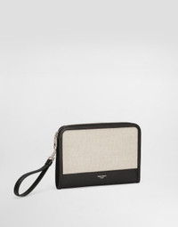 Elegant clutch bag in salt&pepper worked fabric with Calfskin details, perfect for a sophisticated and modern look. Salt&pepper fabric and Calfskin Atene clutch: • White • Leather handles • Antique palladium galvanic zip closure • External and internal customization with film stamp • Flat pocket inside • Item equipped with a logo bag and a pre-assembled box • Measurements: H17,5 x W27 x D3 cm • Made in Italy