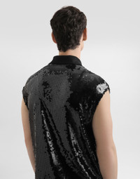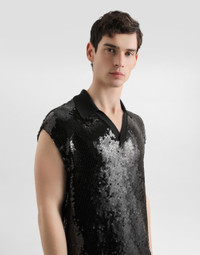 This vest represents the perfect balance between elegance and modernity, ideal for those who want a sophisticated and fashionable look. Sleeveless polo with sequins on tulle: • Black • Regular fit • Sleeveless • Without buttons and buttonholes • Slits at the bottom • The model is 185 cm tall and wears a size 48 IT • Made in Italy External Composition: 94% Polyamide, 6% Elastane