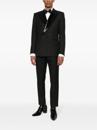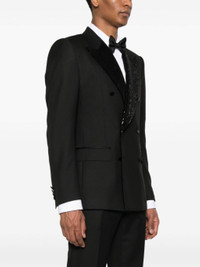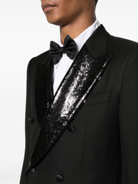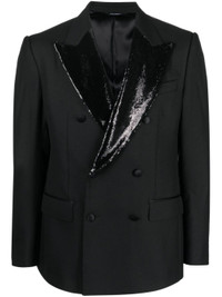 sequin-lapel double-breasted blazer from Dolce & Gabbana featuring black, peak lapels, sequin detailing, double-breasted button fastening, chest welt pocket, two front flap pockets, long sleeves and straight hem. Size & Fit Model Measurements: Height: 1.87 m Bust/Chest: 94.0 cm Hips: 94.0 cm Waist: 71.0 cm Model wears size 50 Fabric and Care Designer Style ID: G2QU4TFURLT Designer Colour: N0000 BLACK Composition: Outer: Polyester 80%, Viscose 18%, Silk 2%; Lining: Silk 100% Washing instructions: Dry Clean Only Made in Italy