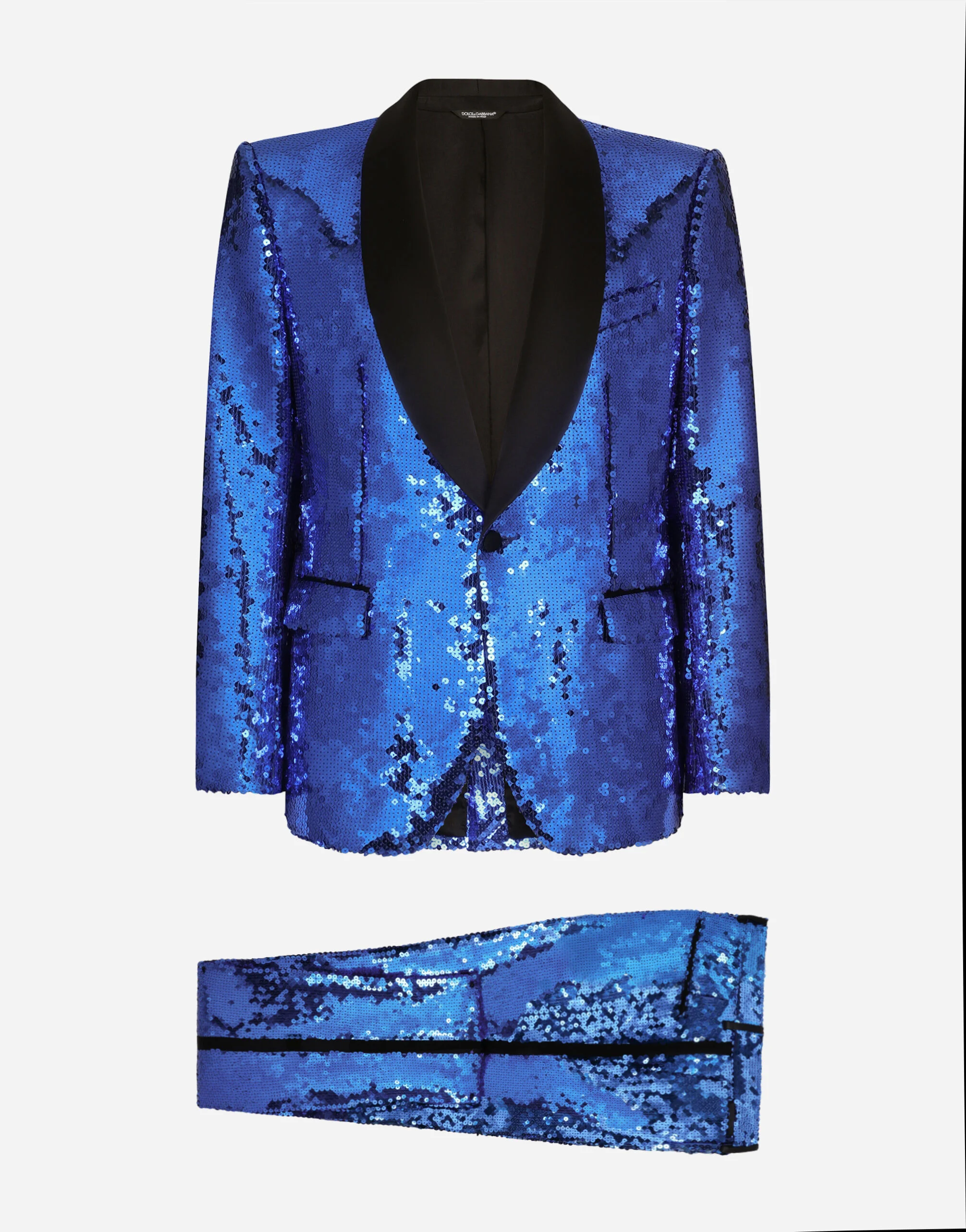 Tailored two-piece sequined tuxedo suit with silk satin details: • Blue • Slim Sicilia fit • Jacket with shawl lapels, flap pockets and breast pocket, inner pockets and central vent • Single-breasted fastening with one button • Lined • Pants with front slant pockets, rear buttoned welt pockets and side bands • The jacket measures 73.5 cm from the back collar seam on a size IT 48 • The pants measure 115 cm on the outer leg and the hem is 17.5 cm wide on a size IT 48 • The model is 185 cm tall and wears a size IT 48 • Made in Italy Care And Details External composition: 83% Polyamide 9% Silk 5% Spandex 3% Polyester Internal composition: 92% Silk 8% Spandex