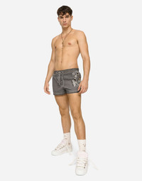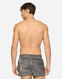 Short garment-dyed light polyester swim trunks with print: • Stretch waistband with a drawstring and nickel-free metal aglets • Side pockets and a small zipped pocket on the back • Inner briefs in soft and comfortable fabric • Matching pouch in the same fabric as the garment • The item measures 31 cm on the outer leg on a size IT 4 • Sizes available: from II to VII • Made in Italy Care And Details External composition: 100% Polyester Internal composition: 85% Polyamide 15% Spandex