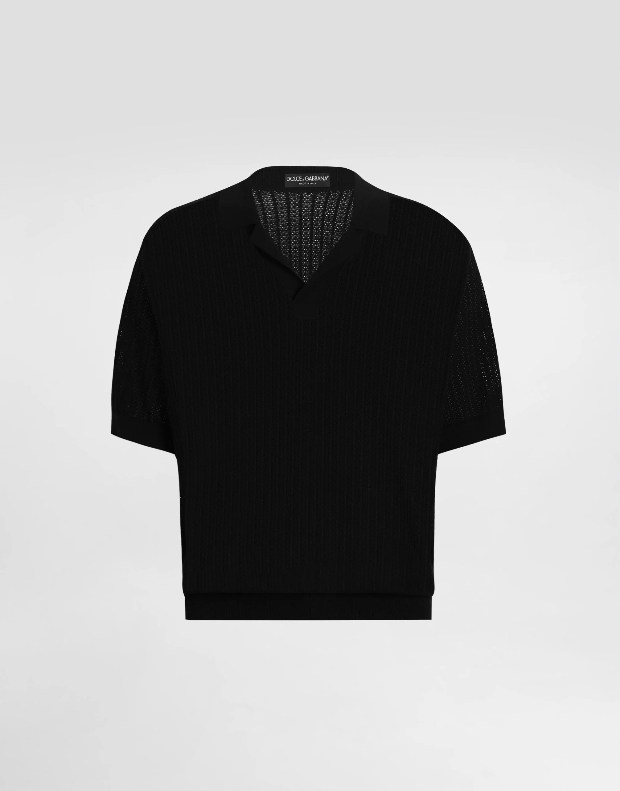 Italy and its beauty are reflected in the Men’s SS25 Collection. Woven raffia and leather give life to jackets, polo-shirts and sweaters to celebrating Italian craftsmanship. The color palette ranges from Nero Sicilia black to burgundy, contributing to conveying a sense of eternal elegance. Refined accessories complement the look: belts and loafers with hand-finished details and oversize bags, such as the Sicily, the Marlene with crocodile-effect print and the versatile Adamo tote. Short-sleeved cotton openwork polo-shirt: • Black • Oversize fit • V-neck • Short sleeves • Ribbed neck and trims • 14-gauge knit • The piece measures 68 cm from the shoulder seam on a size IT 48 • Made in Italy External composition: 100% Cotton