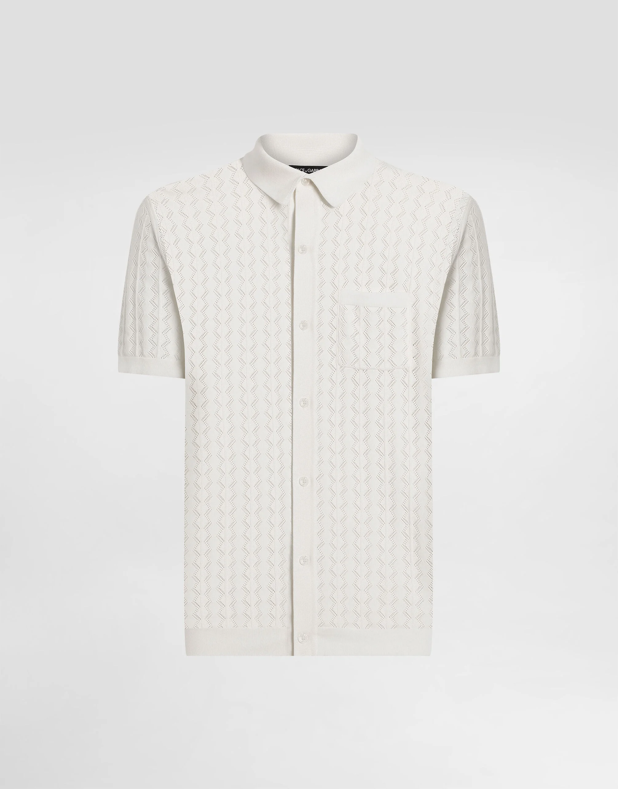 Italy and its beauty are reflected in the Men’s SS25 Collection. Woven raffia and leather give life to jackets, polo-shirts and sweaters to celebrating Italian craftsmanship. The color palette ranges from Nero Sicilia black to burgundy, contributing to conveying a sense of eternal elegance. Refined accessories complement the look: belts and loafers with hand-finished details and oversize bags, such as the Sicily, the Marlene with crocodile-effect print and the versatile Adamo tote. Short-sleeved cotton openwork shirt: • White • Slim fit • Kent collar • Short sleeves • Button fastenings • Patch breast pocket • 14-gauge knit • The piece measures 83 cm from the shoulder seam on a size IT 48 • Made in Italy External composition: 100% Cotton
