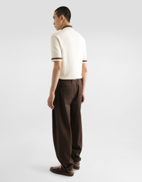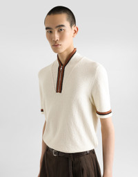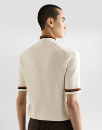 Italy and its beauty are reflected in the Men’s SS25 Collection. Woven raffia and leather give life to jackets, polo-shirts and sweaters to celebrating Italian craftsmanship. The color palette ranges from Nero Sicilia black to burgundy, contributing to conveying a sense of eternal elegance. Refined accessories complement the look: belts and loafers with hand-finished details and oversize bags, such as the Sicily, the Marlene with crocodile-effect print and the versatile Adamo tote. Short-sleeved cotton polo-shirt with inlay: • White • Regular fit • Stand-up collar • Zipper fastening • Short sleeves • 7-gauge knit • The piece measures 68 cm from the shoulder seam on a size IT 48 • Made in Italy External composition: 65% Cotton 35% Polyamide