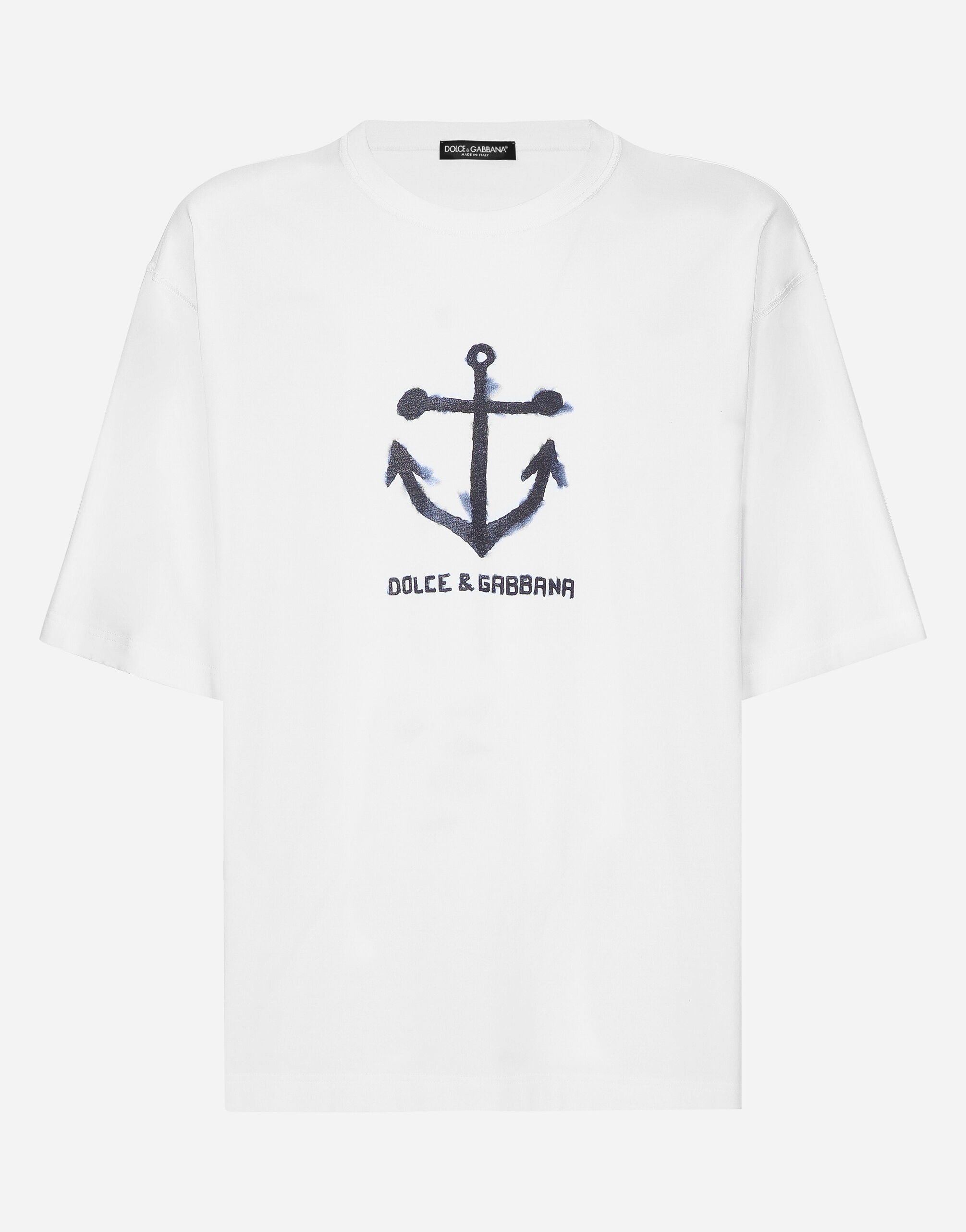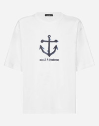 The Marina line has us dreaming of the Mediterranean sea and its myriad shades of blue, while also bringing weathered sailors to mind, yet with a contemporary edge. Aesthetic influences and clear lines, stormy sea blue jackets, multi-pocket pieces, waterproof garments, anchor prints and materials that invite us to discover the “lighthouse keeper”. Fascinating, enigmatic and at times lonely, it tells the tale of a new masculine sensuality built with small yet precise proportions and attention to stylish detail. Cotton T-shirt with Marina print: • White • Oversize fit • Short sleeves • The piece measures 75.5 cm from the shoulder seam on a size M IT • Made in Italy External composition: 100% Cotton