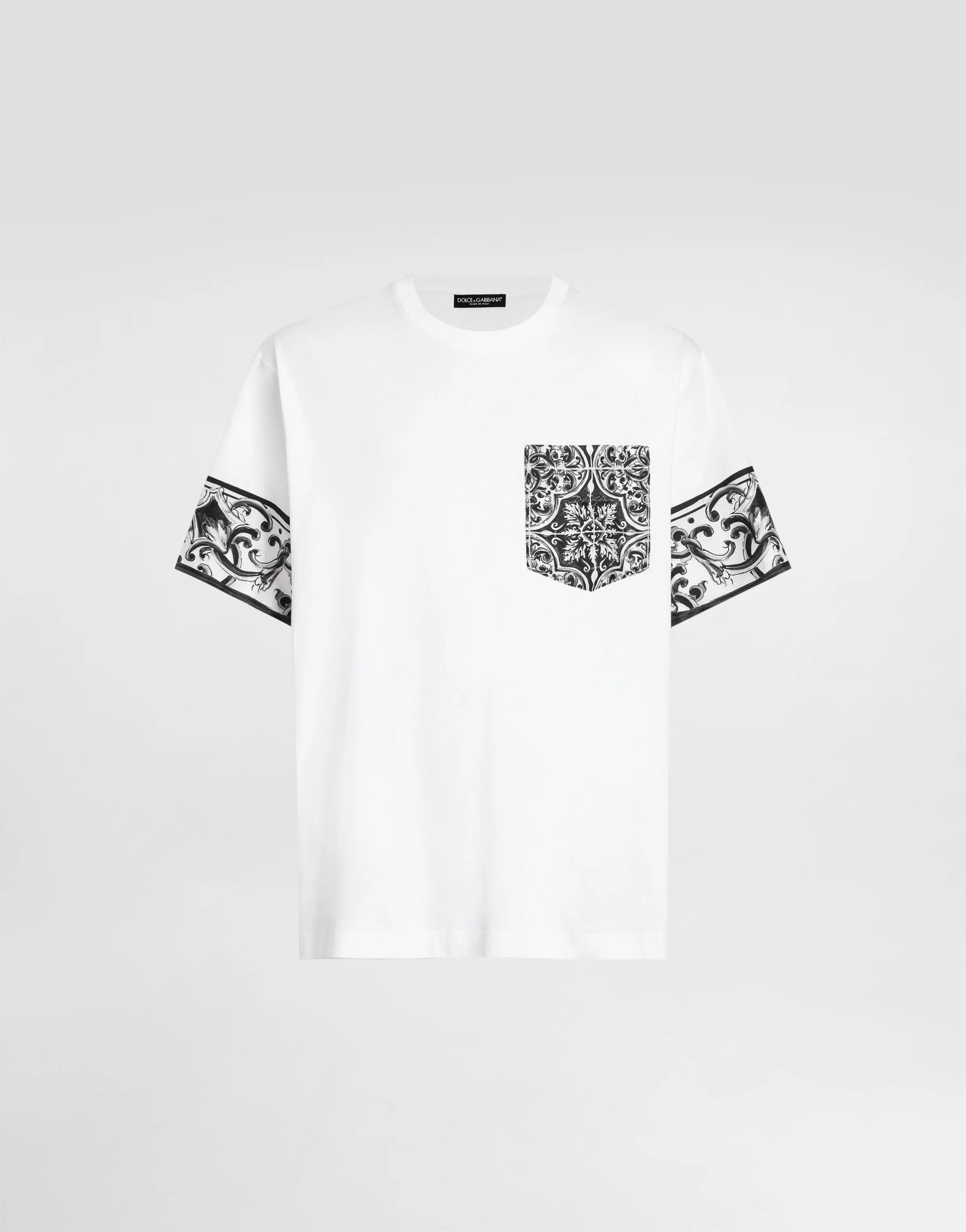 This t-shirt is an essential element for any man's wardrobe, combining comfort and style with a modern design and thoughtful details. Short-sleeved t-shirt with Majolica print: • White • Regular fit • Crew neck • Pocket application • Bottom width 74 cm on size 48 IT • The model is 185 cm tall and wears a size 48 IT • Made in Italy The difference in the print placement that you may find on this product is a feature of Dolce&Gabbana’s “Handmade” pieces. A detail that makes every garment or accessory unique and exclusive. External Composition: 83% Cotton, 17% Silk