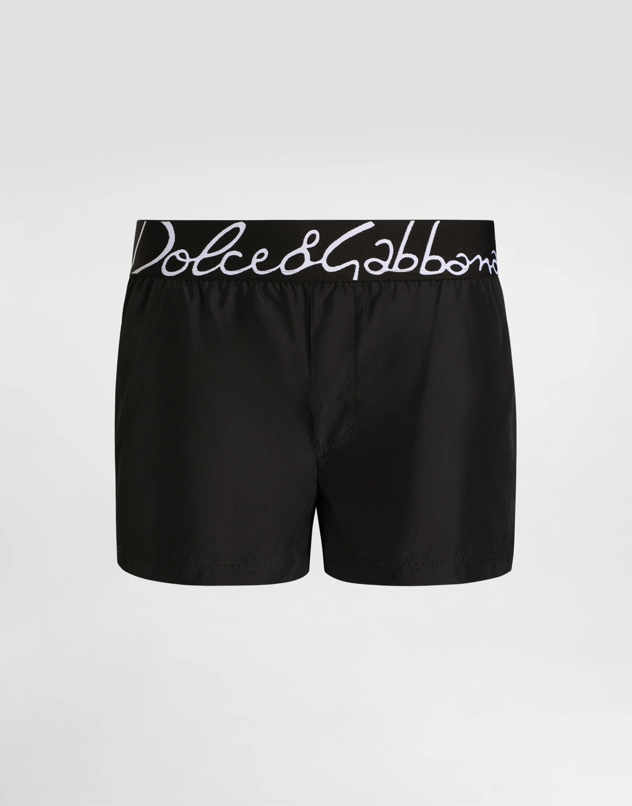 In the “Sartoriale” collection, iconic Italian sartorial heritage is presented from a new perspective, made up of lines, silhouettes and details, concealed buttoning, geometric lapels, and jackets that have seen their proportions completely overhauled. The tale is a journey embarked upon to discover a new kind of tailoring that is perfect in terms of fit, with meticulous attention to detail, that strives to speak and represent the style of the wearer, through small - yet significant - details that will make every piece unique. Short light nylon swim trunks with Dolce&Gabbana logo: • Black • Stretch waistband with the all-over Dolce&Gabbana logo • Side pockets and a small zipped pocket on the back • Inner briefs in soft and comfortable fabric • Matching pouch in the same fabric as the garment with zipper • The item measures 31 cm on the outer leg and the hem is 32 cm wide on a size IT 4 • Made in Italy The difference in the print placement that you may find on this product is a feature of Dolce&Gabbana’s “Handmade” pieces. A detail that makes every garment or accessory unique and exclusive. External composition: 100% Polyester