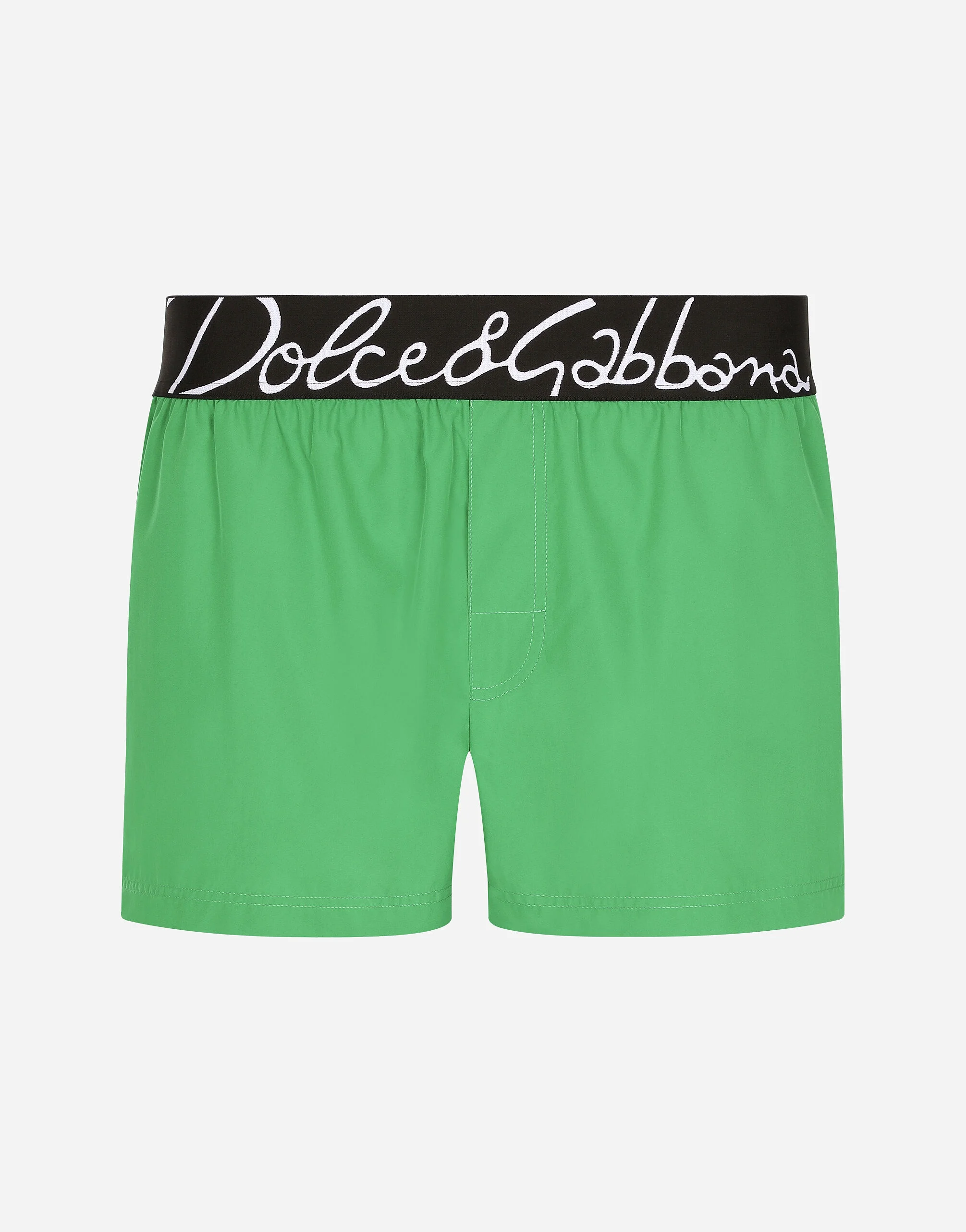 Pictorial, at times volumetric with a textured effect, the decorative “calligraphic-naturalistic” majolica in solid-color green gives life to a collection distinguished by eclectic silhouettes, some stolen from the world of sports, with a cool and light vibe. The vibrant two-tone accenting – green and white – is designed to enhance a series of details, such as the pockets, the green piping paired with the white silk pajamas, the stripes on the polo-shirts, the cuffs on the shirts or the jersey inserts on the T-shirts. Short light nylon swim trunks with Dolce&Gabbana logo: • Green • Stretch waistband with the all-over contrasting Dolce&Gabbana logo • Side pockets and a small zipped pocket on the back • Inner briefs in soft and comfortable fabric • Matching pouch in the same fabric as the garment with zipper • The item measures 32 cm on the outer leg and the hem is 34 cm wide on a size IT 4 • Made in Italy The difference in the print placement that you may find on this product is a feature of Dolce&Gabbana’s “Handmade” pieces. A detail that makes every garment or accessory unique and exclusive. External composition: 100% Polyester