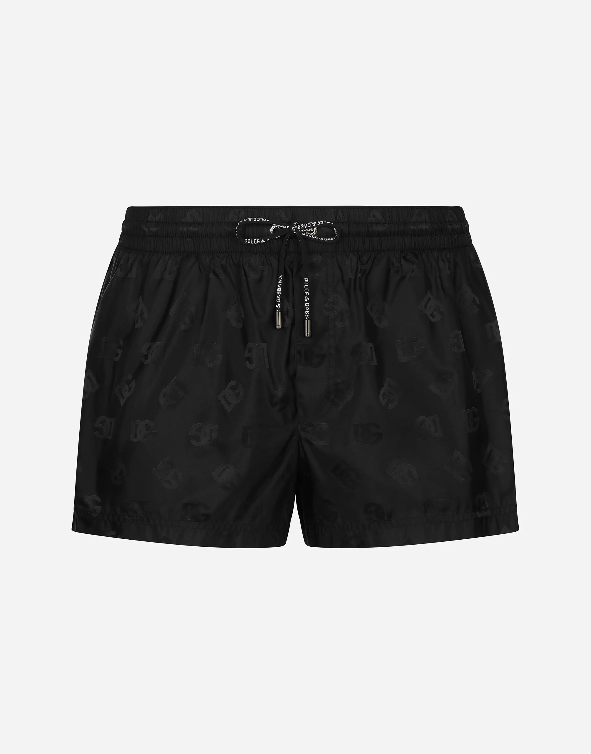 Short light technical satin swim trunks with jacquard DG Monogram: • Black • Logo-detailed stretch waistband with a drawstring and nickel-free metal aglets • Side pockets and a small zipped pocket on the back • Inner briefs in soft and comfortable fabric • Matching pouch in the same fabric as the garment • The item measures 31 cm on the outer leg and the hem is 32 cm wide on a size IT 4 • Made in Italy Care And Details External composition: 100% Polyester Internal composition: 85% Polyamide 15% Spandex