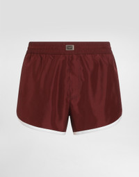 The DNA Men's Collection reimagines daily wear with bold contrasts, meticulous details, and innovative silhouettes. Outerwear stands out with clean lines and high-tech materials, merging sportiness with sophistication in sweaters, sweatshirts, and trousers. A striking color palette, including Black Sicily, caramel, cream, burgundy, and stone gray, pairs with iconic prints like Leopard and Polka dots, enhancing the collection's authentic and refined look. Short solid-color light nylon swim trunks with metal Dolce&Gabbana branded tag: • Burgundy • Stretch waistband and raised faux flap • Side pockets and a small zipped pocket on the back • Inner briefs in soft and comfortable fabric • Matching pouch in the same fabric as the garment with zipper • The item measures 31 cm on the outer leg on a size IT 4 • Made in Italy External composition: 88% Polyamide 12% Spandex Internal composition: 100% Polyester