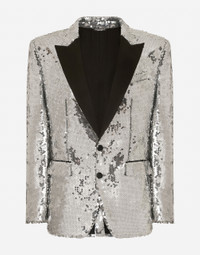 The Holiday collection is an extraordinary story that brings together two worlds: Dolce&Gabbana and the great stars from Hollywood’s Golden Age, who were recognized and admired for their wonderful dresses and extraordinarily glamorous looks. The designers are reinventing and making us dream in front of tailored pieces with breathtaking elegance and visual impact, a sparkling mood that will give everyone a modern, recognizable and unique allure on any occasion. Sequined tailored single-breasted tuxedo jacket with silk duchesse details: • Silver • Slim Sicilia fit • Peak lapels • Covered double-button fastening on the front • Outer flap pockets and breast pocket, and inner welt pockets with button • Covered buttons on the cuffs • Central vent • Lined • The piece measures 73.5 cm from the rear collar seam on a size IT 48 • Made in Italy External composition: 79% Polyamide 12% Silk 5% Spandex 4% Polyester Internal composition: 92% Silk 8% Spandex