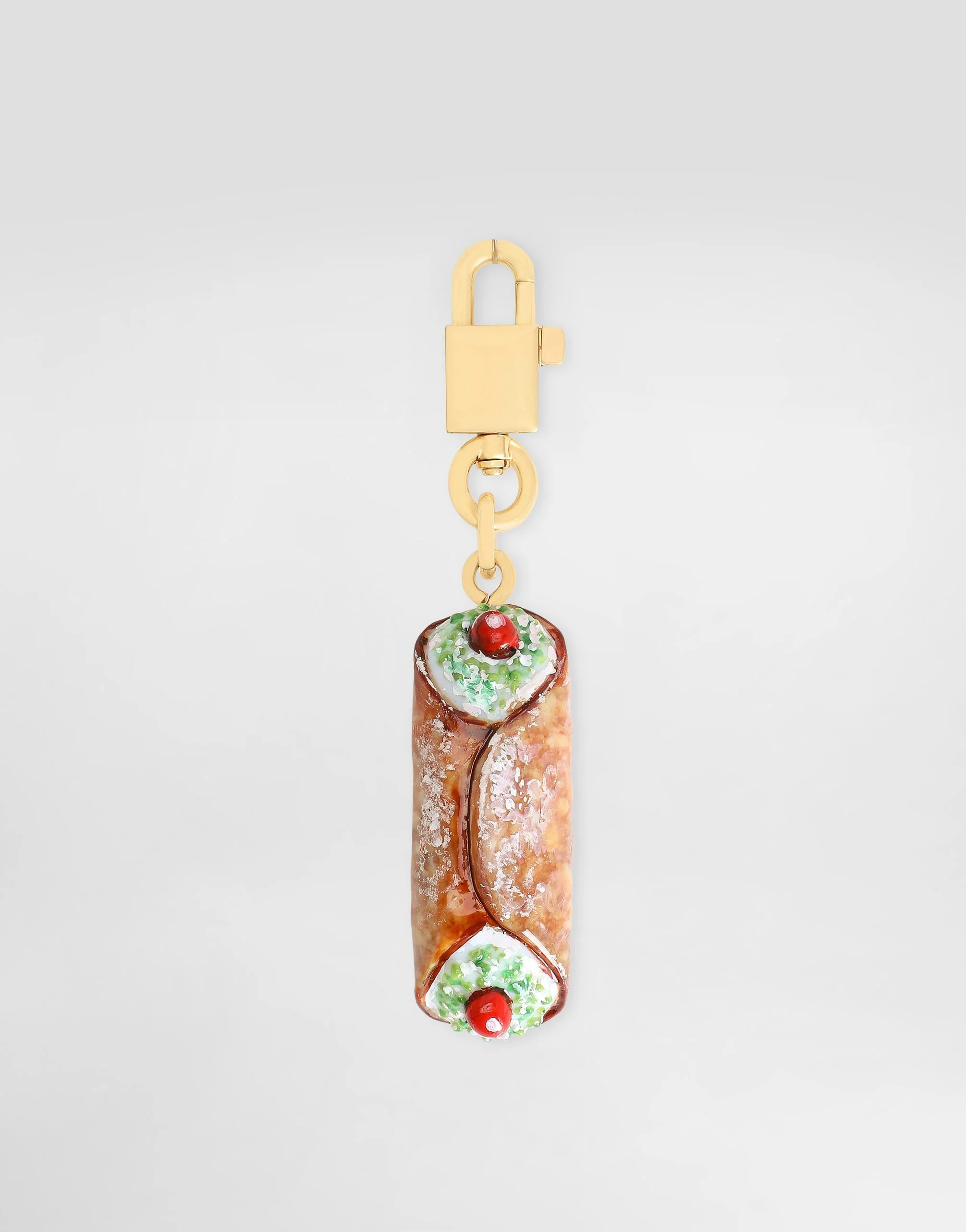 A chic and functional accessory, perfect for adding a touch of elegance to your keychain. Metal and resin charm Cannolo keychain: • Multi-coloured • Vintage brass electroplating clasp • External customization with metal engraving • Item equipped with a logo bag and logoed box • Length 9 cm • Made in Italy External Composition: 61% Brass, 39% Crystal