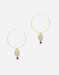 Hoop earrings with a medallion depicting the Madonna, enhanced by a white gold filigree frame. The pendant is embellished with a faceted black jade sphere, hand-set, with the logo "DOLCE&GABBANA" on the back. Technical features: Gold 750/000 Gems: 2 faceted spherical black jades Made in Italy Yellow and White Gold 750/000