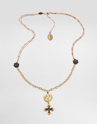 The necklace features a refined double venetian chain in red gold and a "Belcher" chain in yellow gold, separated by two floral motifs in black sapphire. From the double chain hangs a round medallion depicting the Virgin Mary, followed by a Greek cross charm with four black marquise-cut sapphires. An additional medallion with the image of the Virgin Mary, with the "DOLCE&GABBANA" logo on the back, has been added to the end of the adjustable chain. Technical features: Gold 750/000 Length: 50 + 2.5 + 2.5 cm. Gems: 18 round and marquise black sapphires approximately 4.20 ct. Made in Italy Yellow and Red Gold 750/000