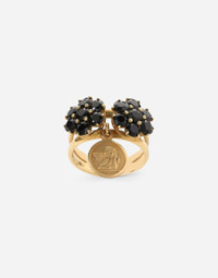 The ring consists of a double band characterized by two floral motifs made of round black sapphires that form the petals and stamens, and a pendant with a cherub angel. Inside the ring, the logo DOLCE&GABBANA has been engraved. Technical features: 750/000 gold Gems: 14 round black sapphires Made in Italy Composition: Yellow Gold 750/000
