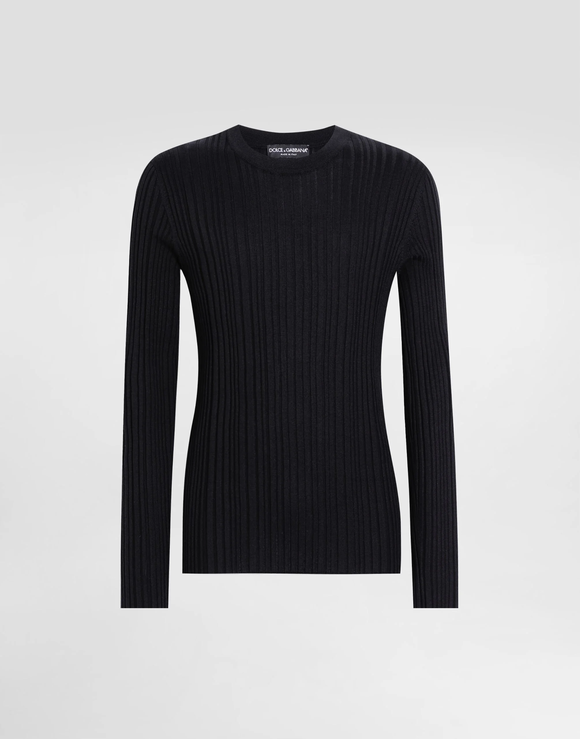 The scene is set for Dolce&Gabbana's distinctive and iconic aesthetic codes in the Collection from Men's Fall/Winter 2025 Fashion Show. The evening lights up with radiant brooches and is enriched with classic suits and blazers of timeless elegance. This crew neck pullover is a must-have for those looking for elegance and comfort. Made with an offset rib knit, it offers a refined look perfect for any occasion. Silk and Cotton pullover: • Black • Crew neck • Long sleeves • Bottom width 68 cm on size 48 IT • The model is 185 cm tall and wears a size 48 IT • Made in Italy External Composition: 55% Silk, 45% Cotton