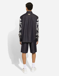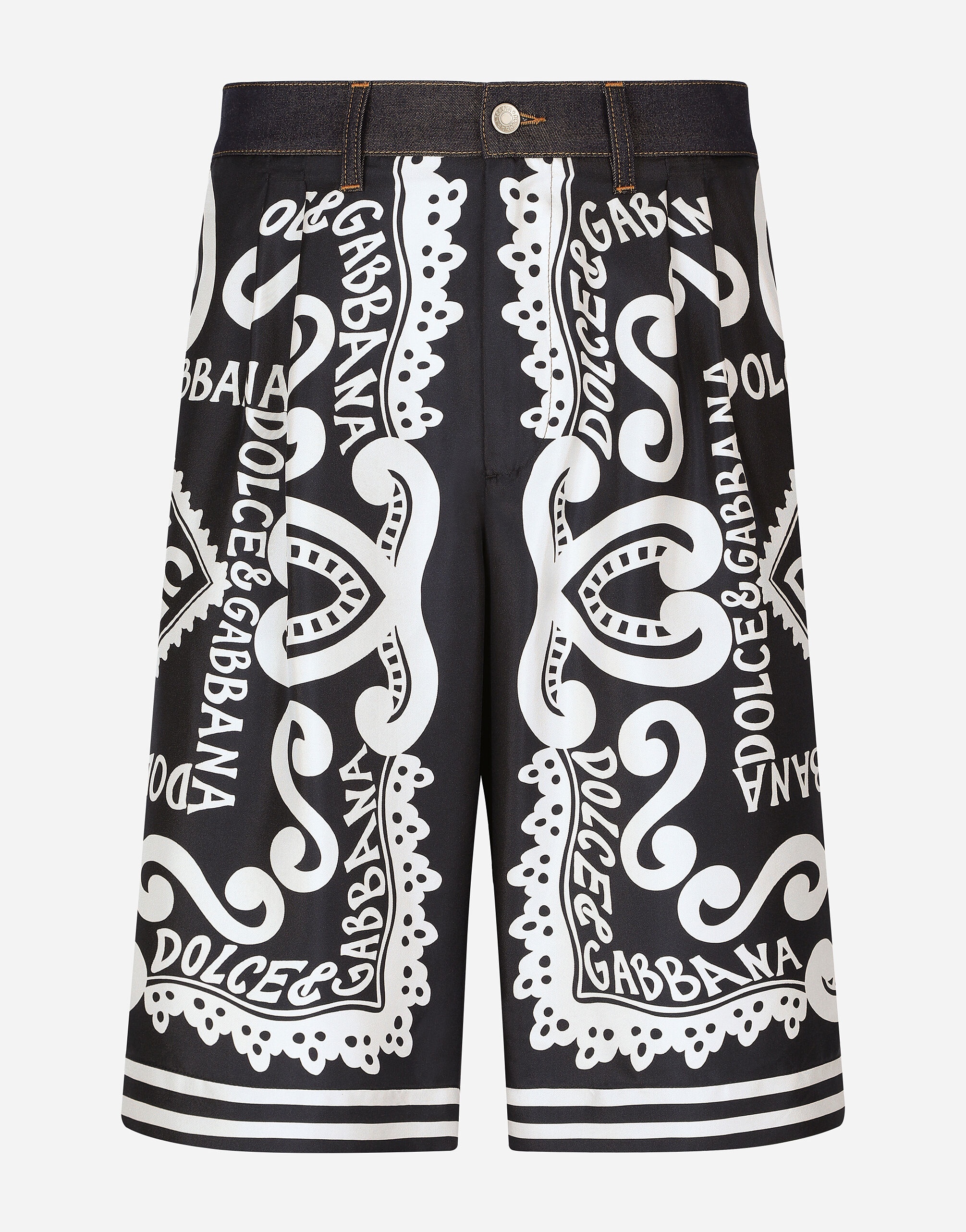 The Marina line has us dreaming of the Mediterranean sea and its myriad shades of blue, while also bringing weathered sailors to mind, yet with a contemporary edge. Aesthetic influences and clear lines, stormy sea blue jackets, multi-pocket pieces, waterproof garments, anchor prints and materials that invite us to discover the “lighthouse keeper”. Fascinating, enigmatic and at times lonely, it tells the tale of a new masculine sensuality built with small yet precise proportions and attention to stylish detail. Five-pocket denim shorts in Marina-print silk and stretch denim: • Blue • Regular fit • Fly-covered zipper and button fastening • Metal Dolce&Gabbana logo tag on the back • The item measures 60 cm on the outer leg and the hem is 34 cm wide on a size IT 48 • Made in Italy The difference in the print placement that you may find on this product is a feature of Dolce&Gabbana’s “Handmade” pieces. A detail that makes every garment or accessory unique and exclusive. External composition: 52% Silk 47% Cotton 1% Spandex