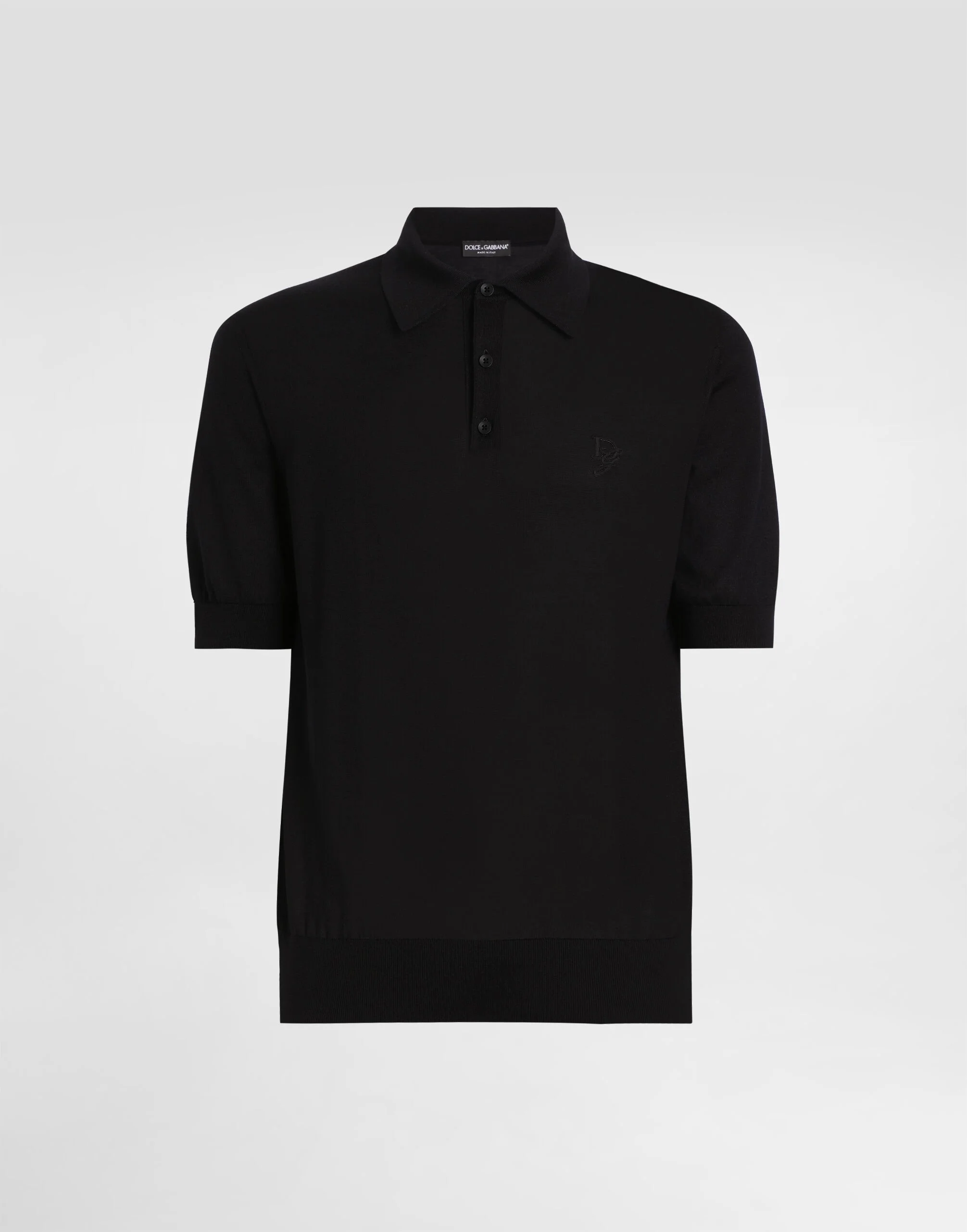 The Italian Holiday Men's Collection revisits 1950s style with a blend of relaxed fits and modern flair. Classic white shirts and tailored suits in refined fabrics contrast with casual denim and playful T-shirts featuring retro graphics with a futuristic twist. Bold prints—chessboards, cats, elegant lighters, and Mediterranean blue ribbons—alongside logo jacquard inspired by ties, infuse a contemporary edge into the essence of Italian holidays. Plain-knit silk polo-shirt with tonal DG logo embroidery: • Black • Regular fit • Button fastenings • Short sleeves • Fine-rib neck, sleeve trims and hem • 18-gauge knit • The piece measures 68 cm from the shoulder seam on a size IT 48 • Made in Italy External composition: 100% Silk