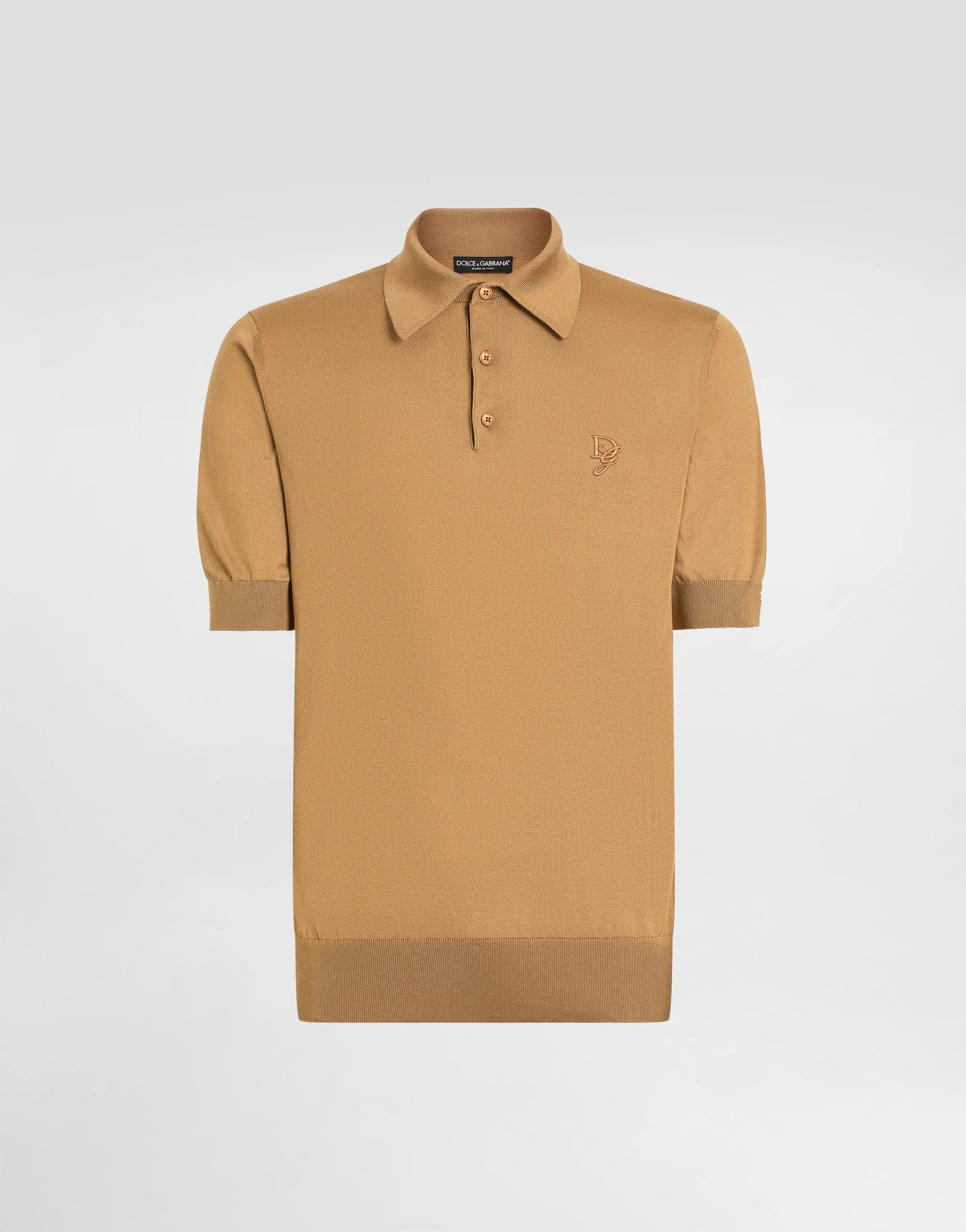 The Italian Holiday Men's Collection revisits 1950s style with a blend of relaxed fits and modern flair. Classic white shirts and tailored suits in refined fabrics contrast with casual denim and playful T-shirts featuring retro graphics with a futuristic twist. Bold prints—chessboards, cats, elegant lighters, and Mediterranean blue ribbons—alongside logo jacquard inspired by ties, infuse a contemporary edge into the essence of Italian holidays. Plain-knit silk polo-shirt with tonal DG logo embroidery: • Beige • Regular fit • Button fastenings • Short sleeves • Fine-rib neck, sleeve trims and hem • 18-gauge knit • The piece measures 68 cm from the shoulder seam on a size IT 48 • Made in Italy External composition: 100% Silk