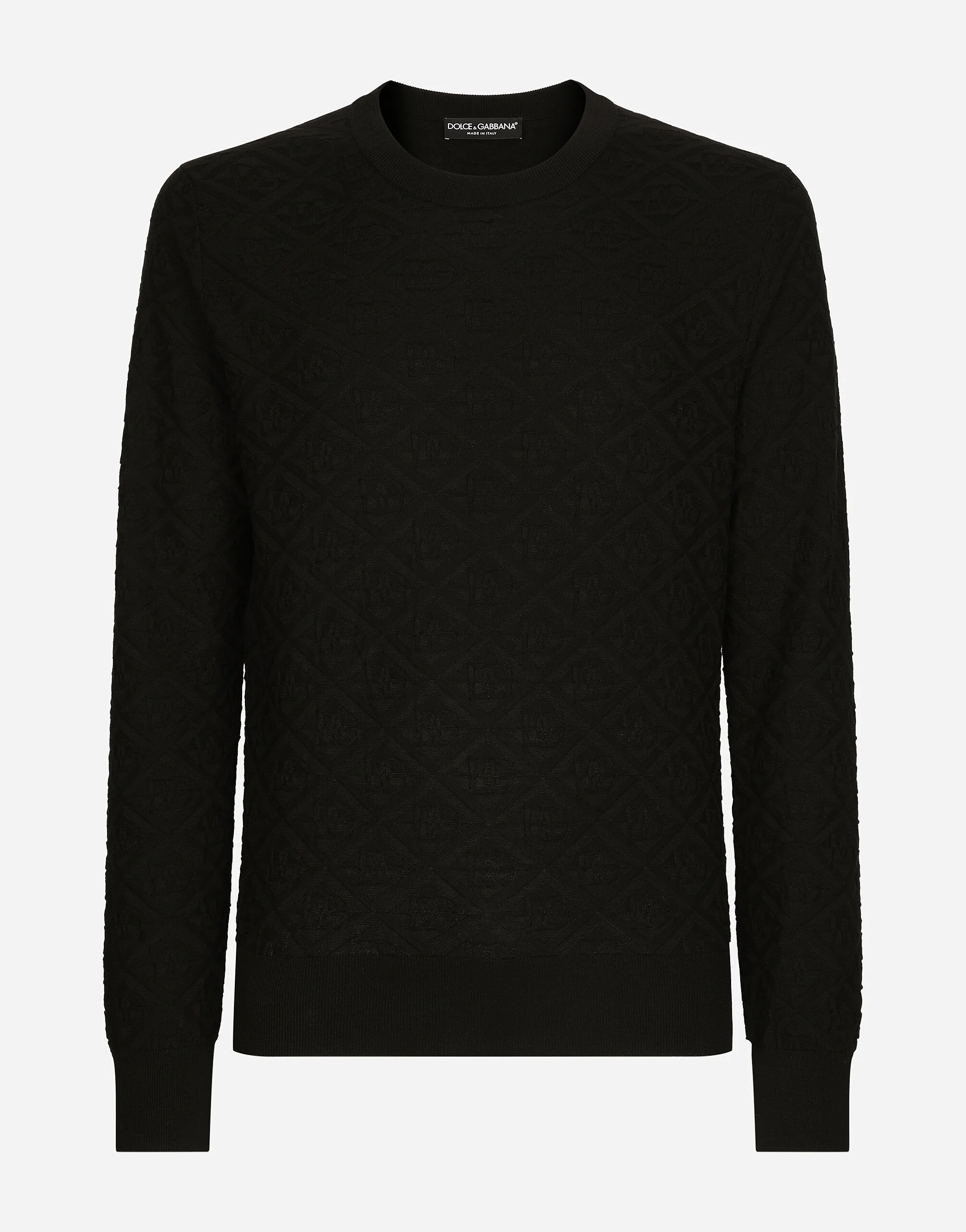 Silk round-neck sweater with all-over DG logo: • Black • Loose fit • Long sleeves • Fine-rib sleeve trims and neck • 18-gauge plain knit with all-over logo on the front/back • The piece measures 69 cm from the shoulder seam on a size IT 48 • Made in Italy Silk round-neck sweater with all-over DG logo: • Black • Loose fit • Long sleeves • Fine-rib sleeve trims and neck • 18-gauge plain knit with all-over logo on the front/back • The piece measures 69 cm from the shoulder seam on a size IT 48 • Made in Italy External composition: 100% Silk