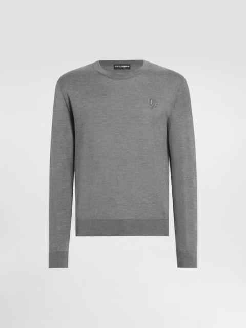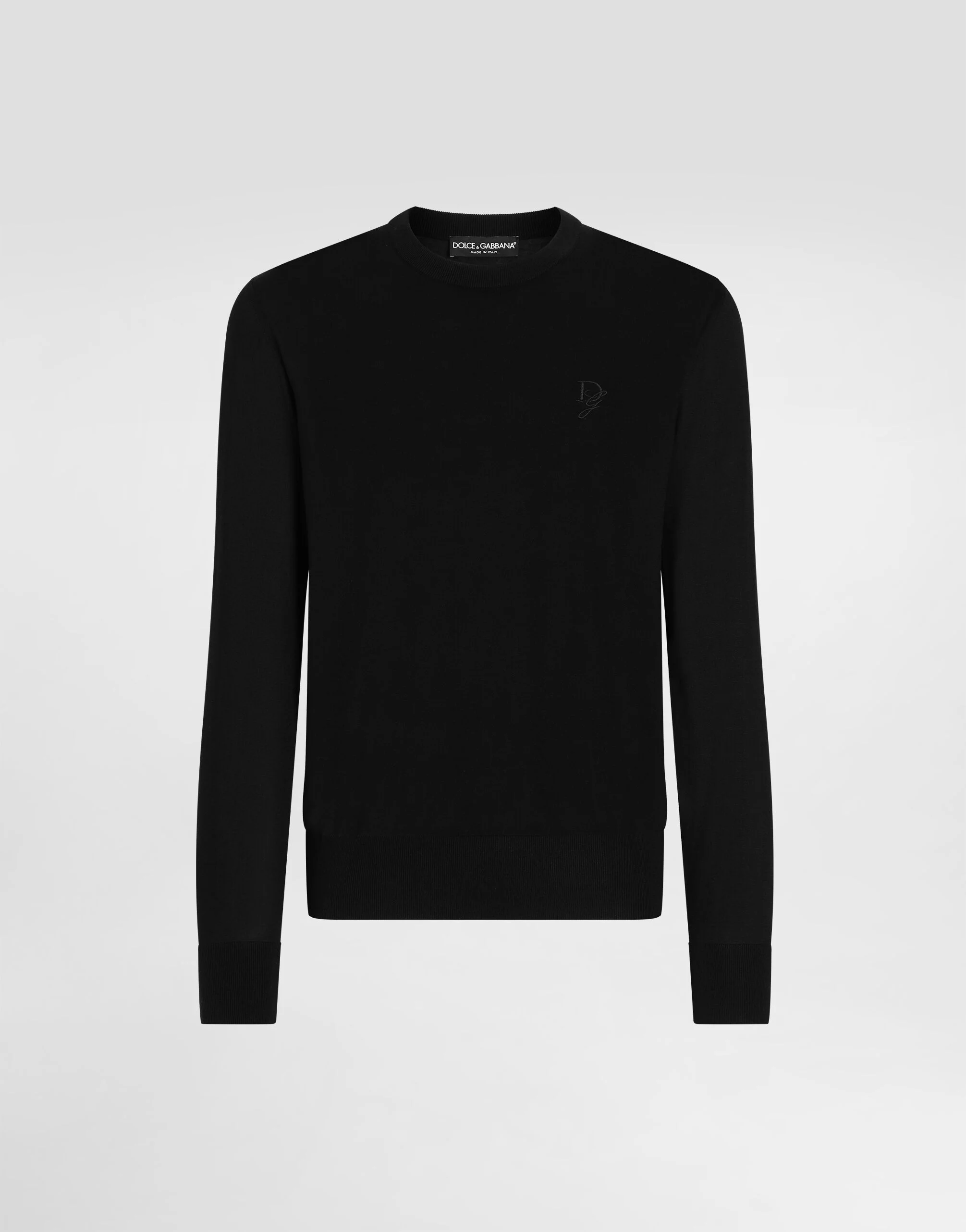 The Italian Holiday Men's Collection revisits 1950s style with a blend of relaxed fits and modern flair. Classic white shirts and tailored suits in refined fabrics contrast with casual denim and playful T-shirts featuring retro graphics with a futuristic twist. Bold prints—chessboards, cats, elegant lighters, and Mediterranean blue ribbons—alongside logo jacquard inspired by ties, infuse a contemporary edge into the essence of Italian holidays. Silk V-neck sweater with DG embroidery: • Black • Regular fit • Long sleeves • Fine-rib sleeve trims and neck • 18-gauge plain knit • The piece measures 69 cm from the shoulder seam on a size IT 48 • Made in Italy External composition: 100% Silk
