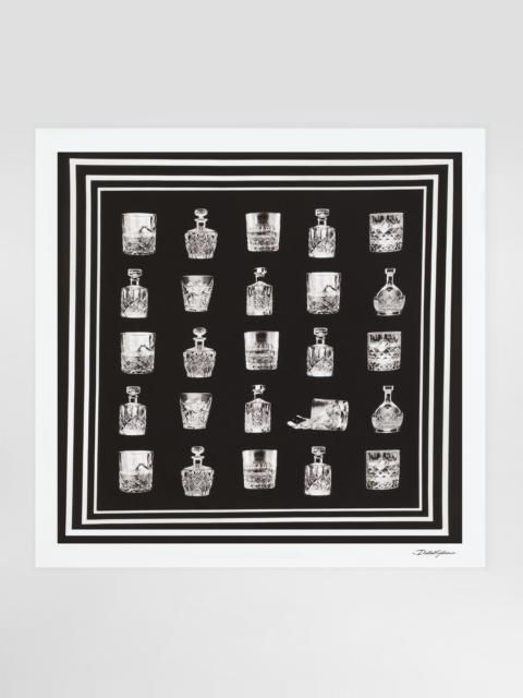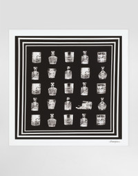 The Italian Holiday Men's Collection revisits 1950s style with a blend of relaxed fits and modern flair. Classic white shirts and tailored suits in refined fabrics contrast with casual denim and playful T-shirts featuring retro graphics with a futuristic twist. Bold prints—chessboards, cats, elegant lighters, and Mediterranean blue ribbons—alongside logo jacquard inspired by ties, infuse a contemporary edge into the essence of Italian holidays. Silk twill scarf with liquor print: • Black • Measurements: 70 x 70 cm • Made in Italy The difference in the print placement that you may find on this product is a feature of Dolce&Gabbana’s “Handmade” pieces. A detail that makes every garment or accessory unique and exclusive. External composition: 100% Silk