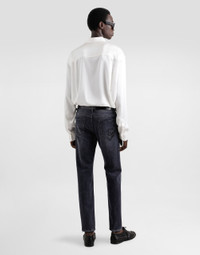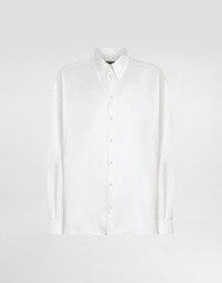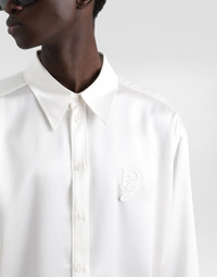 The Italian Holiday Men's Collection revisits 1950s style with a blend of relaxed fits and modern flair. Classic white shirts and tailored suits in refined fabrics contrast with casual denim and playful T-shirts featuring retro graphics with a futuristic twist. Bold prints—chessboards, cats, elegant lighters, and Mediterranean blue ribbons—alongside logo jacquard inspired by ties, infuse a contemporary edge into the essence of Italian holidays. Silk satin shirt with tonal DG logo embroidery: • White • Oversize fit • Italian collar • Button fastenings • Long sleeves • The piece measures 80 cm from the rear collar seam on a size IT 40 • Made in Italy External composition: 100% Silk