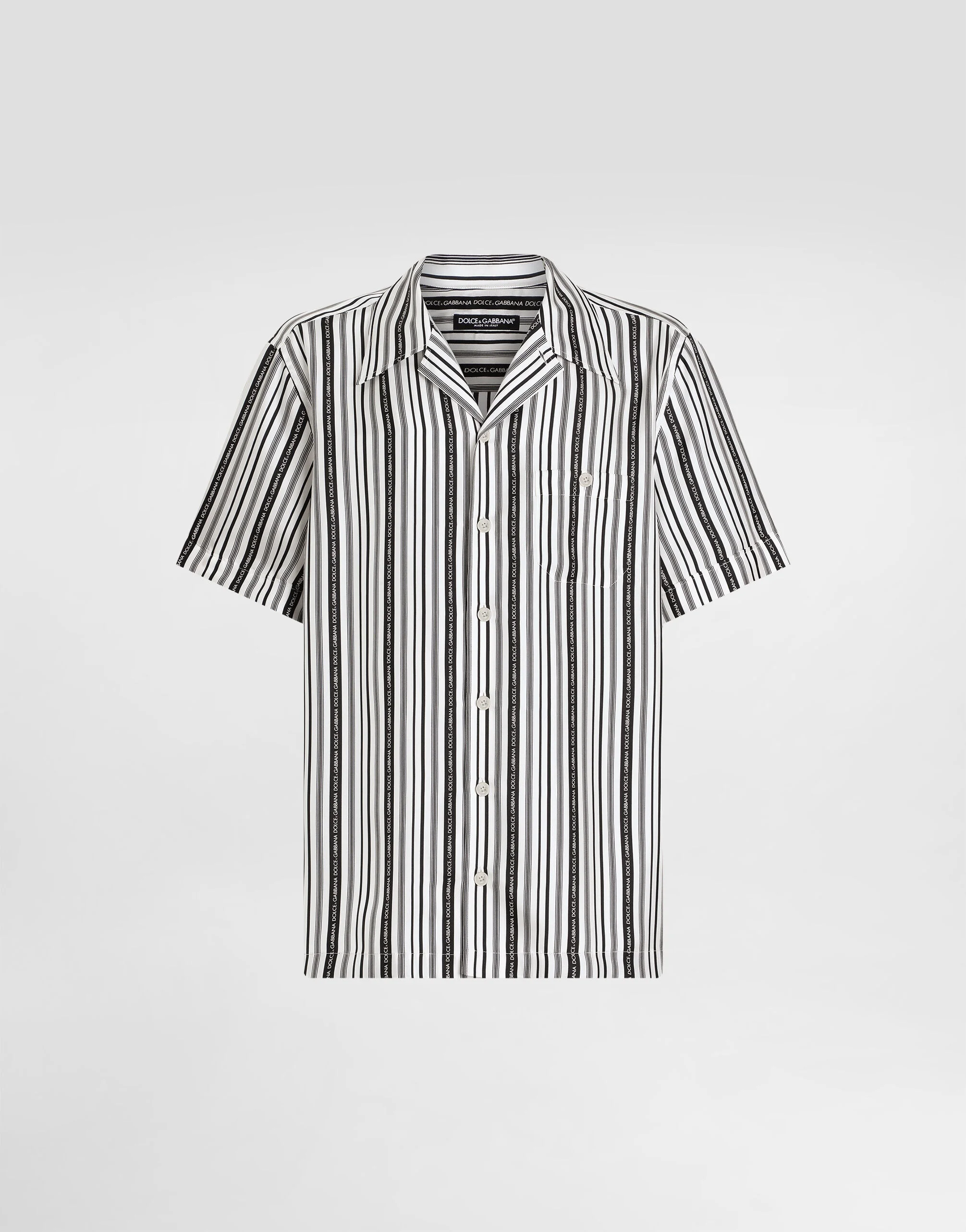 The Italian Holiday Men's Collection revisits 1950s style with a blend of relaxed fits and modern flair. Classic white shirts and tailored suits in refined fabrics contrast with casual denim and playful T-shirts featuring retro graphics with a futuristic twist. Bold prints—chessboards, cats, elegant lighters, and Mediterranean blue ribbons—alongside logo jacquard inspired by ties, infuse a contemporary edge into the essence of Italian holidays. Silk twill Hawaiian shirt with tie print: • White • Regular fit • Hawaiian collar • Short sleeves • Button fastenings and breast pocket • The piece measures 78 cm from the rear collar seam on a size IT 40 • Made in Italy The difference in the print placement that you may find on this product is a feature of Dolce&Gabbana’s “Handmade” pieces. A detail that makes every garment or accessory unique and exclusive. External composition: 100% Silk