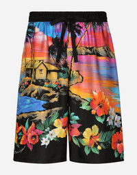 Silk twill jogging shorts with Hawaiian print