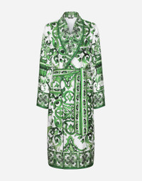 Pictorial, at times volumetric with a textured effect, the decorative “calligraphic-naturalistic” majolica in solid-color green gives life to a collection distinguished by eclectic silhouettes, some stolen from the world of sports, with a cool and light vibe. The vibrant two-tone accenting – green and white – is designed to enhance a series of details, such as the pockets, the green piping paired with the white silk pajamas, the stripes on the polo-shirts, the cuffs on the shirts or the jersey inserts on the T-shirts. Silk twill robe with majolica print: • Green and white • Shawl lapels • Wrap fastening with belt • Front patch pockets • Contrasting-color trims • Silk lining • The piece measures 130 cm from the rear collar seam on a size IT 48 • Made in Italy The difference in the print placement that you may find on this product is a feature of Dolce&Gabbana’s “Handmade” pieces. A detail that makes every garment or accessory unique and exclusive. External composition: 100% Silk Internal composition: 100% Silk