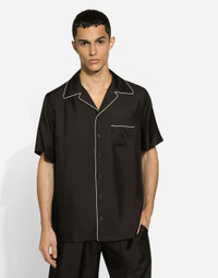 Tailoring means beauty, proportions, skilled cuts and sophisticated details. The FW 24-25 Sartoriale Collection builds on this solid foundation to define new ways of pairing colors, materials and textures. Sicilian rock gray envelops different textures, while Nero Sicilia black adorns textile and velvet weaves and camel pairs with orange. Various types of pinstripes, textured-effect cashmere, double fabrics, suede and denim meet in the looks. Silk twill shirt: • Black • Loose fit • Shirt-style collar • Button fastenings • Short sleeves • Front patch breast pocket with DG logo embroidery • Contrasting-color piping • The piece measures 78 cm from the rear collar seam on a size IT 40 • Made in Italy External composition: 100% Silk
