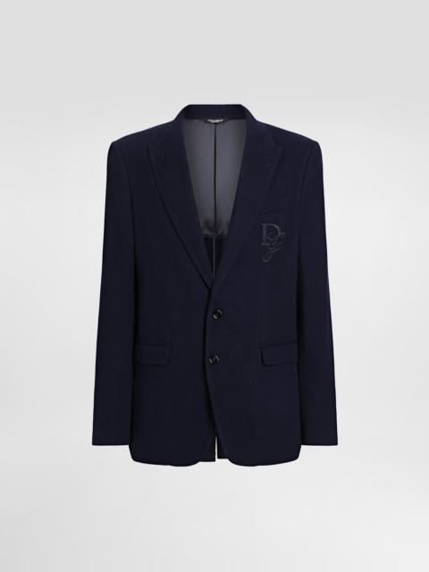 The Italian Holiday Men's Collection revisits 1950s style with a blend of relaxed fits and modern flair. Classic white shirts and tailored suits in refined fabrics contrast with casual denim and playful T-shirts featuring retro graphics with a futuristic twist. Bold prints—chessboards, cats, elegant lighters, and Mediterranean blue ribbons—alongside logo jacquard inspired by ties, infuse a contemporary edge into the essence of Italian holidays. Tailored single-breasted stretch jersey jacket with tonal DG logo embroidery: • White • Taormina fit • Notched lapels • Button fastenings on the front • Outer flap pockets and breast pocket, inner welt pockets • Buttoned cuffs • Central vent • Partially lined • The piece measures 73.5 cm from the rear collar seam on a size IT 48 • Made in Italy External composition: 76% Viscose 22% Polyamide 2% Spandex Internal composition: 55% Polyester 45% Viscose