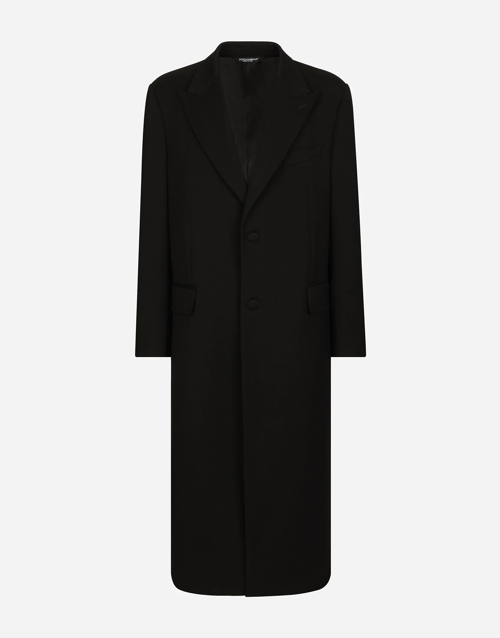 The SS24 “Stile” Collection recounts and clearly presents a strong concept: the unique and unmistakable style of Dolce&Gabbana. A word that is more than a statement. It is a concept! The designers work with surfaces, textures, layers and color nuances, as well as the sheen and fineness of the materials themselves, creating a “Stylish” collection. We’re going back to our roots with the desire to reaffirm the “Stile” - style -, flair and iconic DNA of the brand. Single-breasted double-face stretch wool coat: • Black • Regular fit • Peak lapels • Button fastenings • Flap pockets and breast pocket, inner pockets with double piping • Half-belt on the back • Buttoned cuffs • Central vent • Lined • The piece measures 130 cm from the rear collar seam on a size IT 48 • Made in Italy External composition: 98% Virgin Wool 2% Spandex Internal composition: 100% Silk
