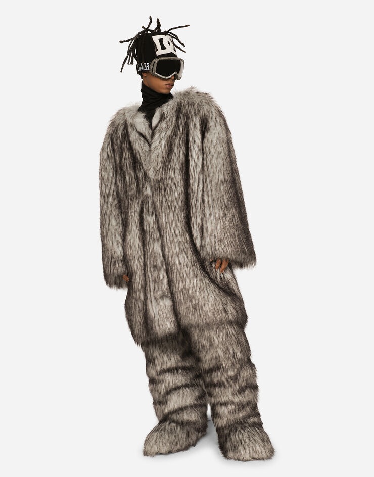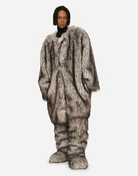 Faux wolf fur coat with faux leather details: • Light insulated padding on the interior • Regular fit • Round neck • Press-stud fastenings • Welt pockets on the exterior • Lined • The piece measures 100 cm from the rear collar seam on a size IT 48 • The model is 185 cm tall and wears a size IT 48 • Made in Italy Care And Details External composition: 43% Modacrylic 36% Polyester 21% Acetate Internal composition: 100% Viscose