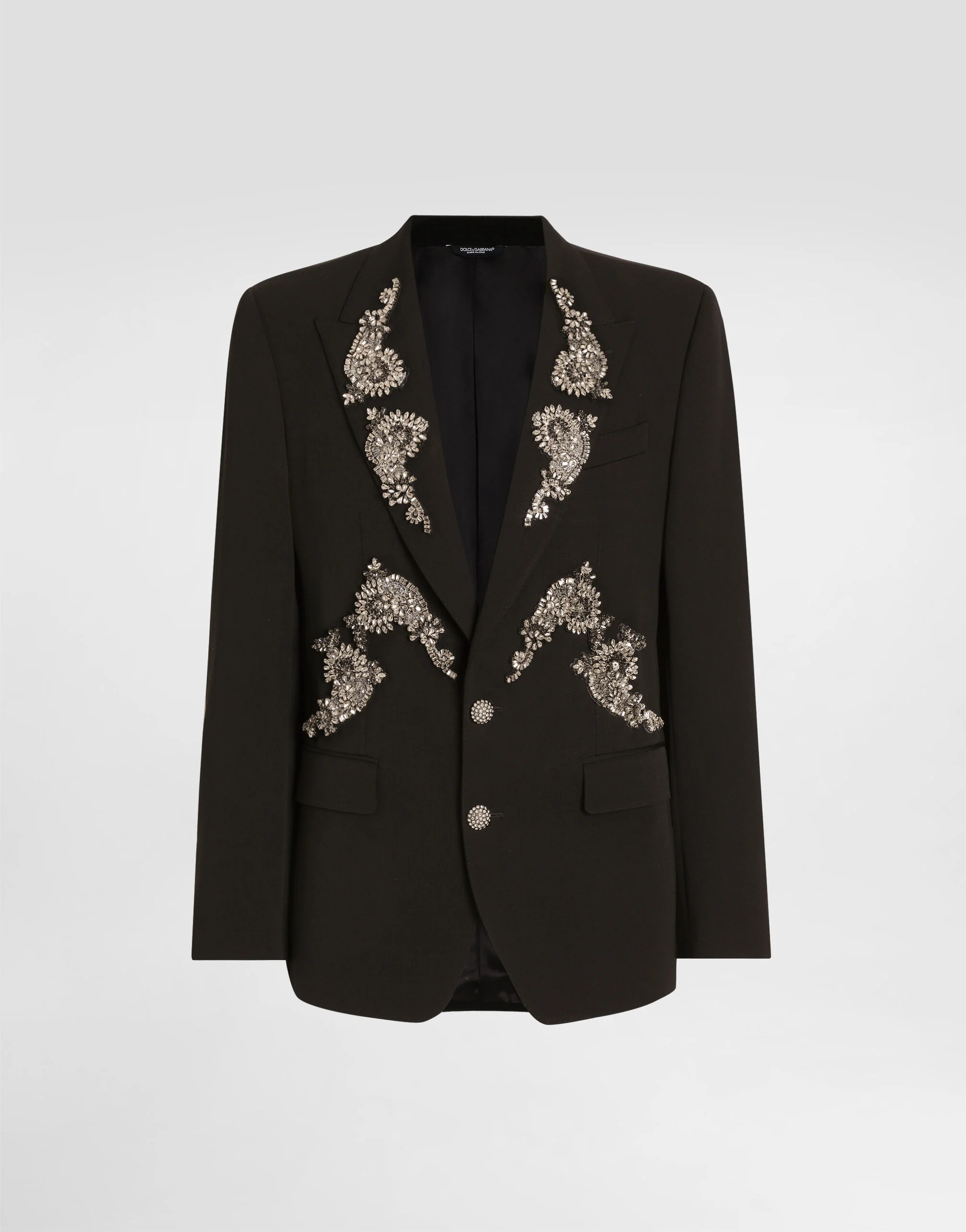 This jacket represents the elegance and refinement of the Italian sartorial tradition, perfect for special occasions and gala evenings. Single-breasted jacket with jewel embellishments: • Black • Rounded lapels • With buttons • Center back length 73.5 on size 48 IT • The model is 185 cm tall and wears a size 48 IT • Made in Italy External Composition: 100% Virgin Wool Internal Composition: 100% Silk