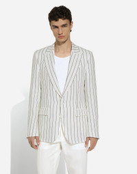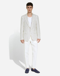 The Marina line has us dreaming of the Mediterranean sea and its myriad shades of blue, while also bringing weathered sailors to mind, yet with a contemporary edge. Aesthetic influences and clear lines, stormy sea Blue jackets, multi-pocket pieces, waterproof garments, anchor prints and materials that invite us to discover the “lighthouse keeper”. Fascinating, enigmatic and at times lonely, it tells the tale of a new masculine sensuality built with small yet precise proportions and attention to stylish detail. Single-breasted linen jacket: • White • Slim Sicilia fit • Peak lapels • Double-button fastening on the front • Outer flap pockets and breast pocket, inner welt pockets • Buttoned cuffs • Central vent • Unlined • The piece measures 73.5 cm from the rear collar seam on a size IT 48 • Made in Italy External composition: 100% Linen Internal composition: 100% Cotton