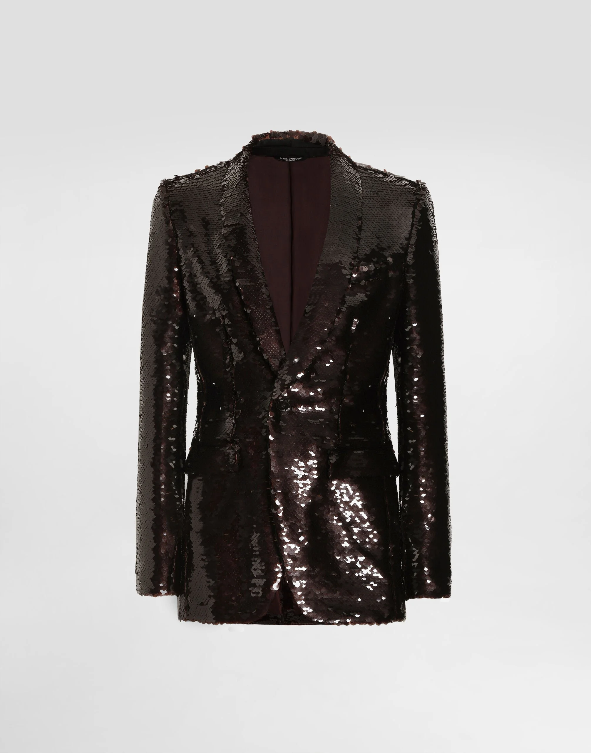 The scene is set for Dolce&Gabbana's distinctive and iconic aesthetic codes in the Collection from Men's Fall/Winter 2025 Fashion Show. The evening lights up with radiant brooches and is enriched with classic suits and blazers of timeless elegance. This single-breasted jacket with shawl lapels is a masterpiece of elegance and style, perfect for those who want to stand out with a sophisticated and modern look. Single-breasted sequin jacket: • Brown • Deconstructed Sicily Light shape • Rounded shawl lapels • Lined and canvassed • The model is 185 cm tall and wears a size 48 IT • Made in Italy External Composition: 90% Polyester, 8% Elastane, 2% Silk Internal Composition: 100% Silk