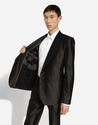 Two-piece tailored suit in shantung silk with enameled buttons: • Black • Slim Sicilia fit • Jacket with peak lapels, flap pockets and breast pocket, two inner pockets and central vent • Single-breasted fastening with two buttons • Lined • Pants with front slant pockets and rear buttoned welt pockets • The jacket measures 73.5 cm from the back collar seam on a size IT 48 • The pants measure 115 cm on the outer leg and the hem is 17.5 cm wide on a size IT 48 • The model is 185 cm tall and wears a size IT 48 • Made in Italy Care And Details External composition: 100% Silk Internal composition: 78% Silk 22% Viscose