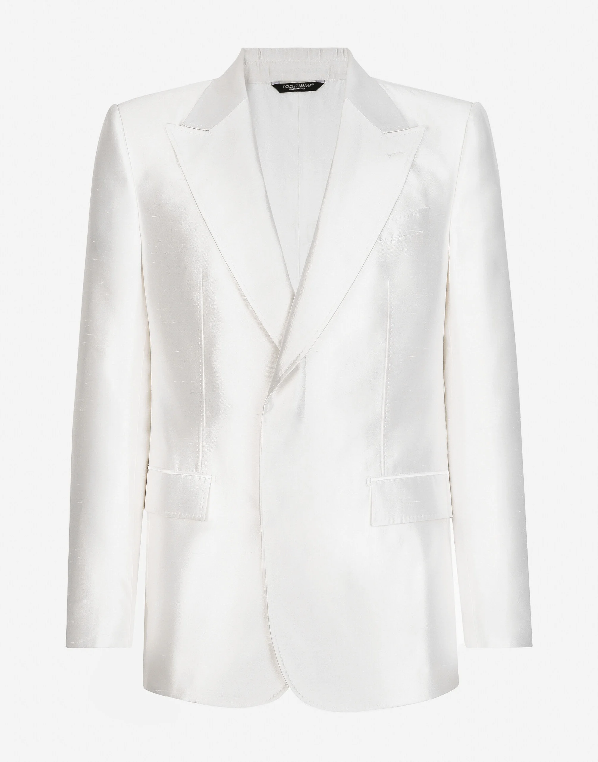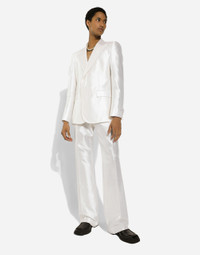 The Marina line has us dreaming of the Mediterranean sea and its myriad shades of blue, while also bringing weathered sailors to mind, yet with a contemporary edge. Aesthetic influences and clear lines, stormy sea Blue jackets, multi-pocket pieces, waterproof garments, anchor prints and materials that invite us to discover the “lighthouse keeper”. Fascinating, enigmatic and at times lonely, it tells the tale of a new masculine sensuality built with small yet precise proportions and attention to stylish detail. Single-breasted silk shantung jacket: • White • Slim Sicilia fit • Peak lapels • Double-button covered placket on the front • Outer flap pockets and breast pocket, inner welt pockets • Buttoned cuffs • Central vent • Unlined • The piece measures 73.5 cm from the rear collar seam on a size IT 48 • Made in Italy External composition: 100% Silk Internal composition: 100% Silk