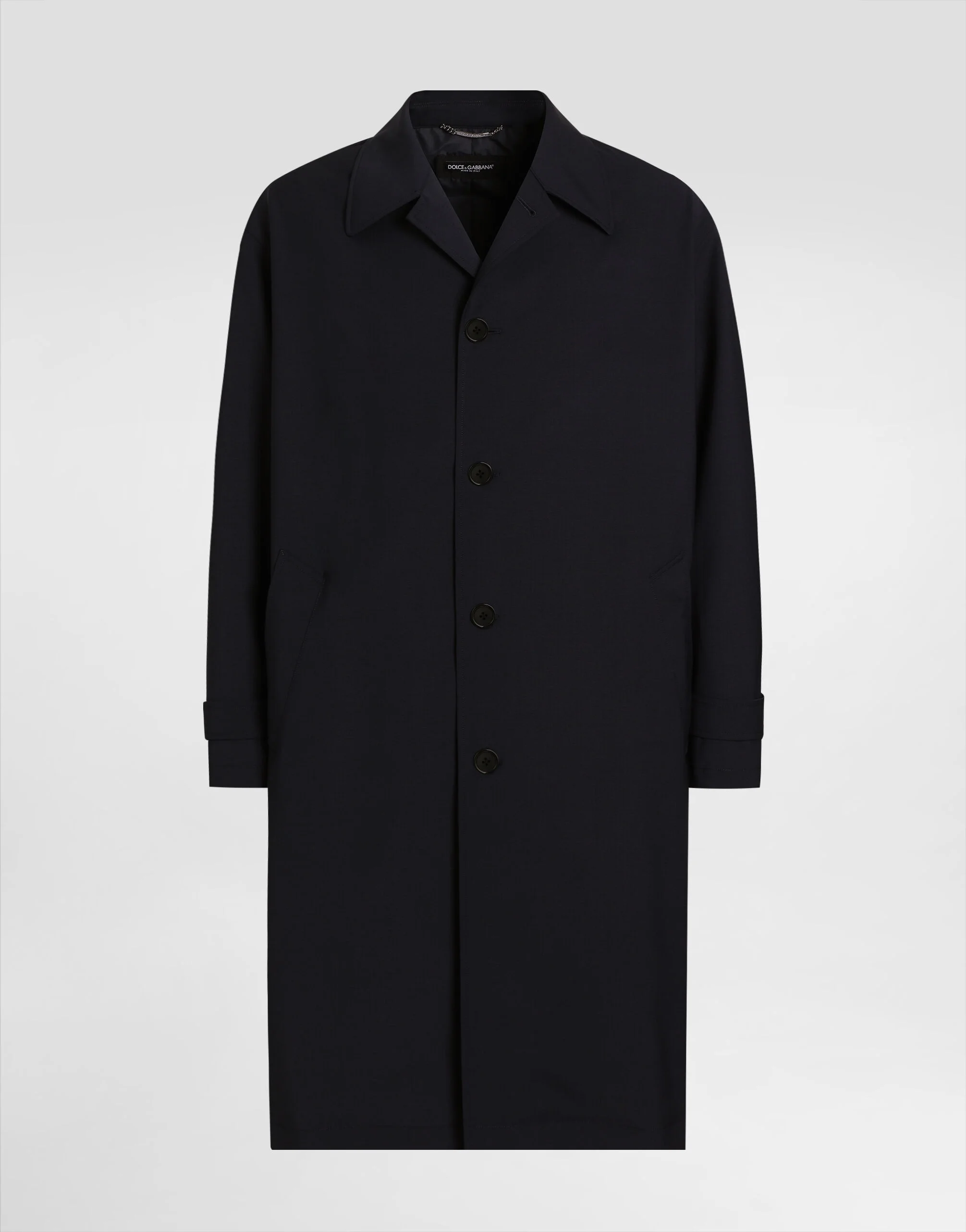 The DNA Men's Collection reimagines daily wear with bold contrasts, meticulous details, and innovative silhouettes. Outerwear stands out with clean lines and high-tech materials, merging sportiness with sophistication in sweaters, sweatshirts, and trousers. A striking color palette, including Black Sicily, caramel, cream, burgundy, and stone gray, pairs with iconic prints like Leopard and Polka dots, enhancing the collection's authentic and refined look. Single-breasted woolen trench coat: • Blue • Regular fit • Button fastenings on the front • Outer welt pockets with press-stud buttons and inner pockets with zipper • Adjustable strap and buckle on the cuff • Central rear vent • Lined • The piece measures 110 cm from the rear collar seam on a size IT 48 • Made in Italy External composition: 55% Wool 41% Polyester 4% Spandex Internal composition: 100% Polyester